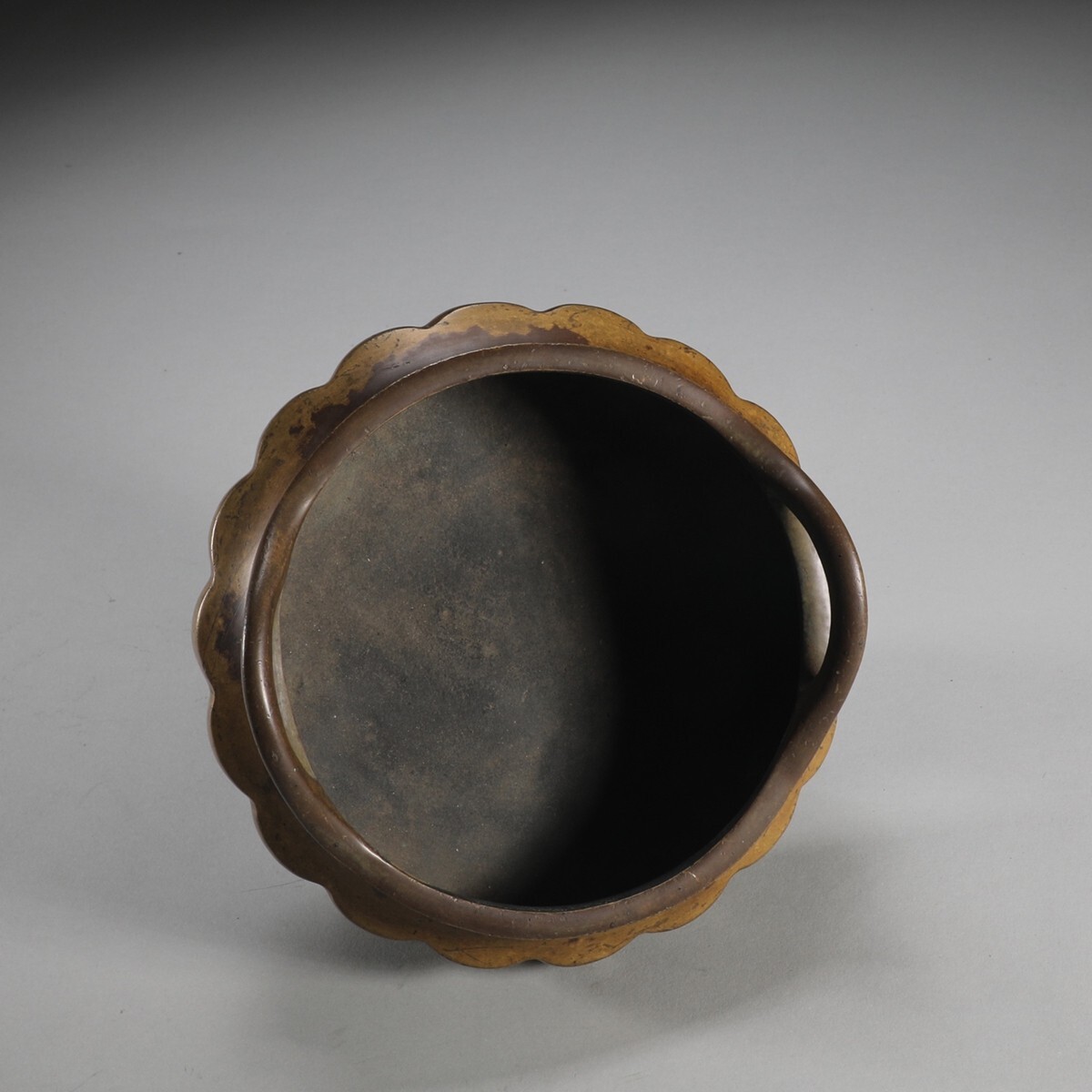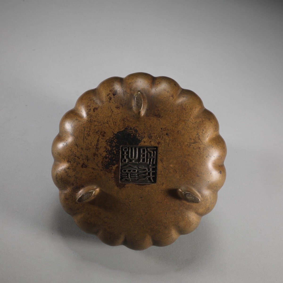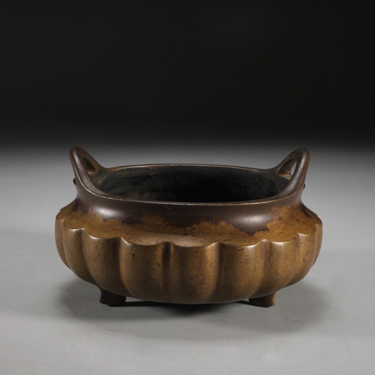 「明代 底款 古銅彫 瓜稜紋 橋耳老銅香炉」旧銅器 置物擺件 賞物 中国古美術 旧蔵出