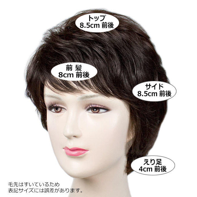 各部の毛長さは画像に記載いたしておりますが、毛先をすいているので多少の誤差があります。また、頭や顔の大きさや形状により襟足やサイドおよび前髪の毛先の位置が画像と比べ、上下することがあります。そのためイメージが異なる場合もございます。