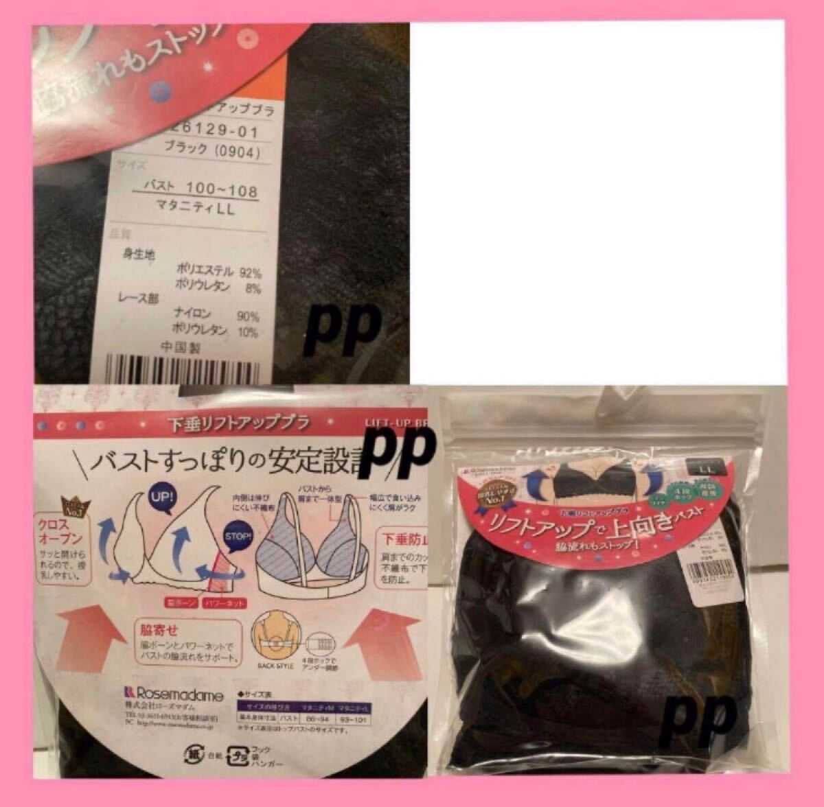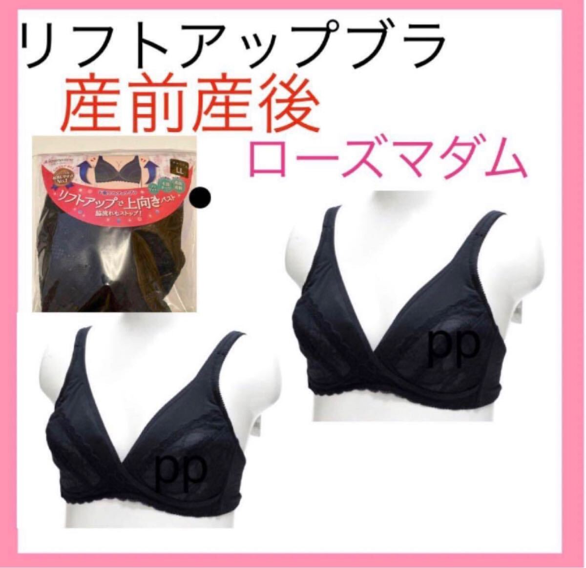 ローズマダム 授乳ブラジャー LL下垂防止 ブラ ノンワイヤー リフトアップブラ ブラック 産前産後 マタニティ インナー 下着 2枚