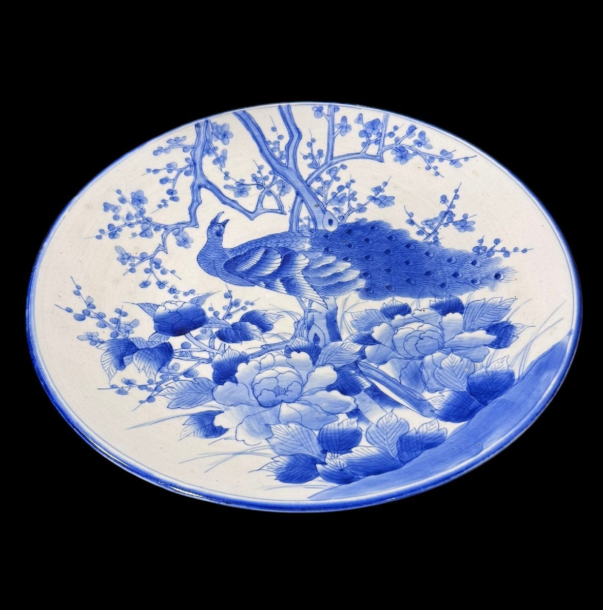 蔵出し 古伊万里 染付 絵皿 孔雀 牡丹図 大皿 丸皿 幕末 明治 取り皿 盛り皿 飾り皿 和食器 時代物 骨董品 アンティーク