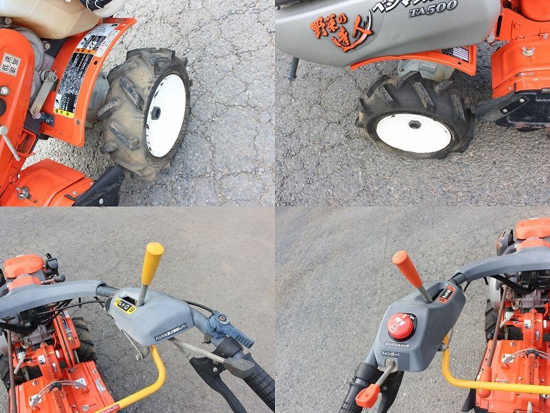 ■商品説明■ | 茨城発 クボタ 中古 管理機 TA500 こちらの商品は「来店引取」にてお願いします。 ※発送ご希望の方はお電話ください。 茨城県水戸市より出品しております ※【発送詳細】をご確認ください。 主要内容 ◎ガソリンエンジン ◎4.3馬力 ◎前進4段/後進2段 ◎PTOレバー ◎左右サイドクラッチ ◎ハンドル180度回転式 ◎耕耘幅 約400㎜ 動作確認 〇空運転で動作確認済み 〇 〇 〇 ※実作業での確認等は出来ていません 注意事項 ● ● ●中古品特有のサビ・汚れ・凹み・変形等有ります。 ●現状での販売となります。 当方の気付かない点や説明不足も含めて中古品・現状渡しであることをご理解の上、検討をお願いいたします。 |