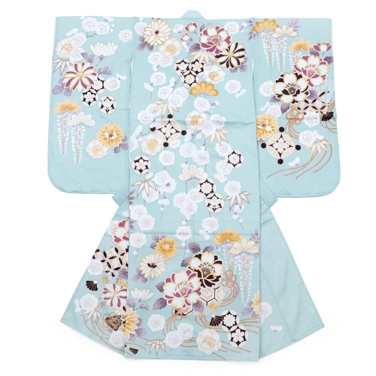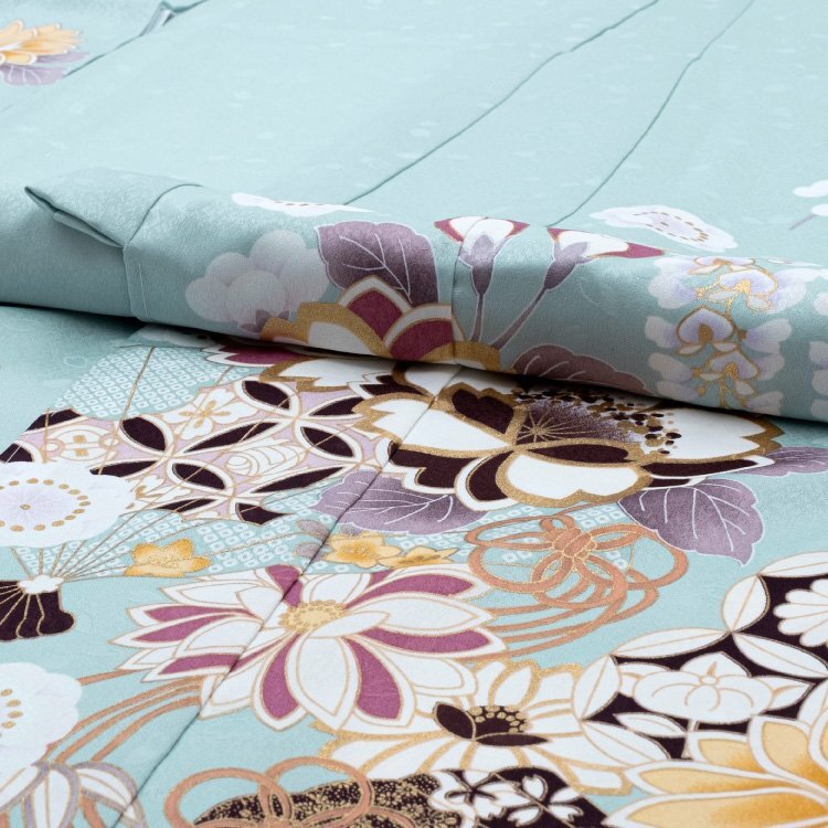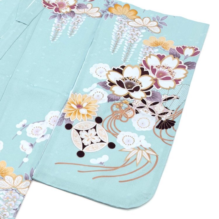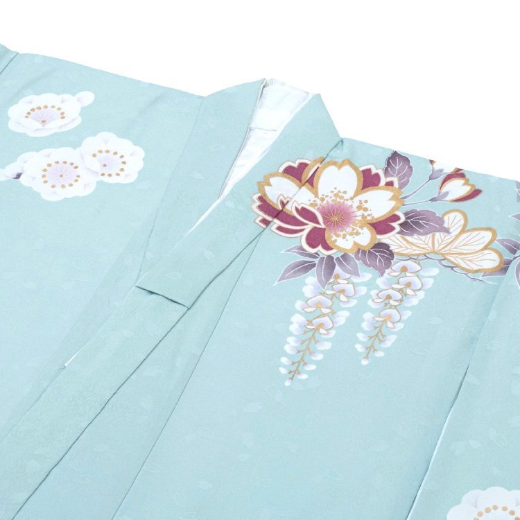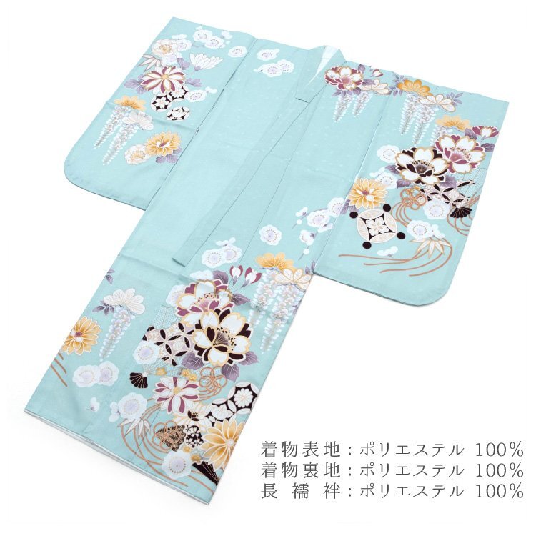 | 素材 | 着 物 : ポリエステル 100% 長襦袢 : ポリエステル 100% 結び帯 : ポリエステル 100% 帯揚げ : ナイロン 100% しごき : ポリエステル100% |