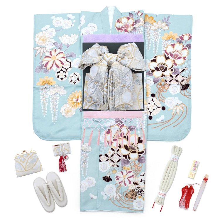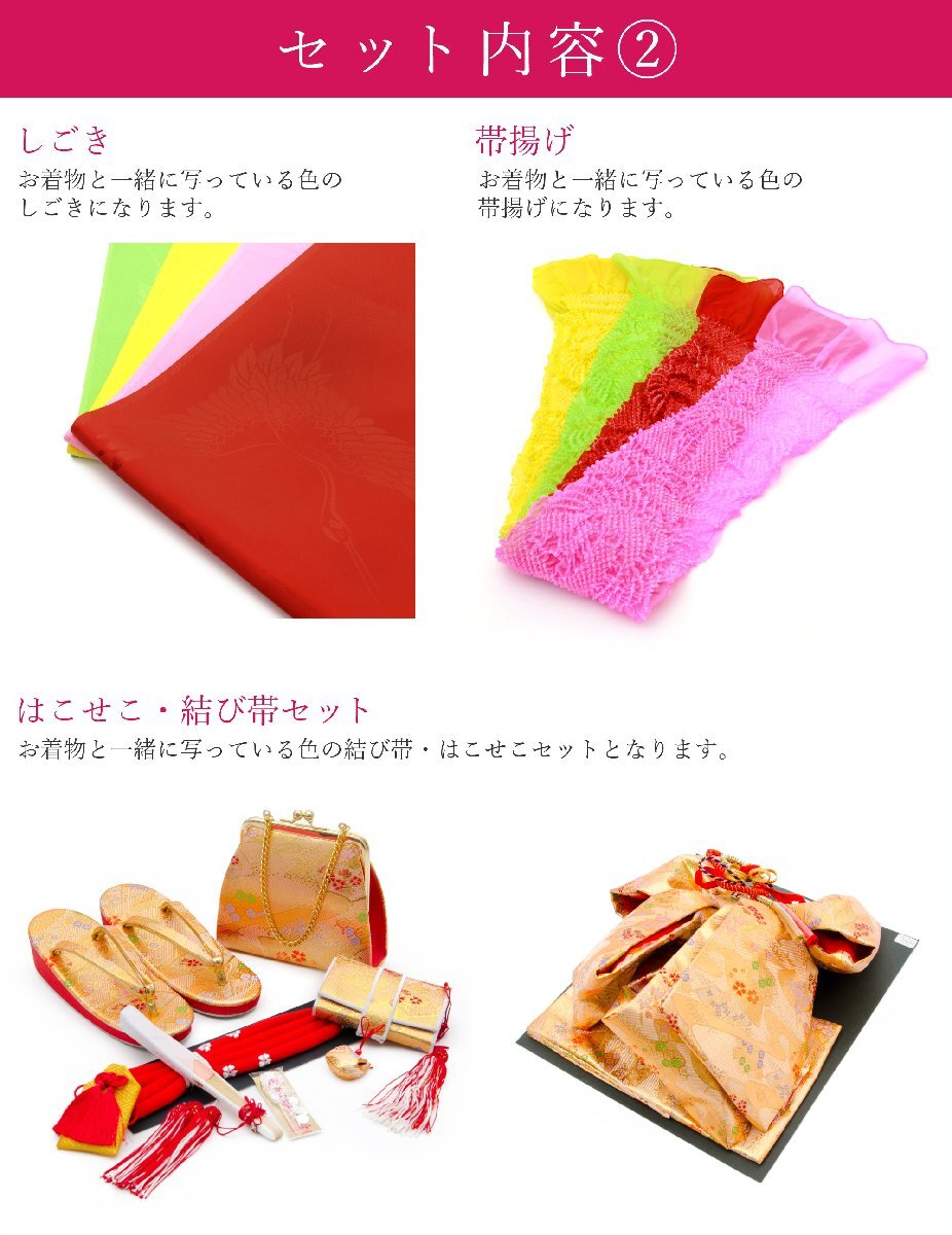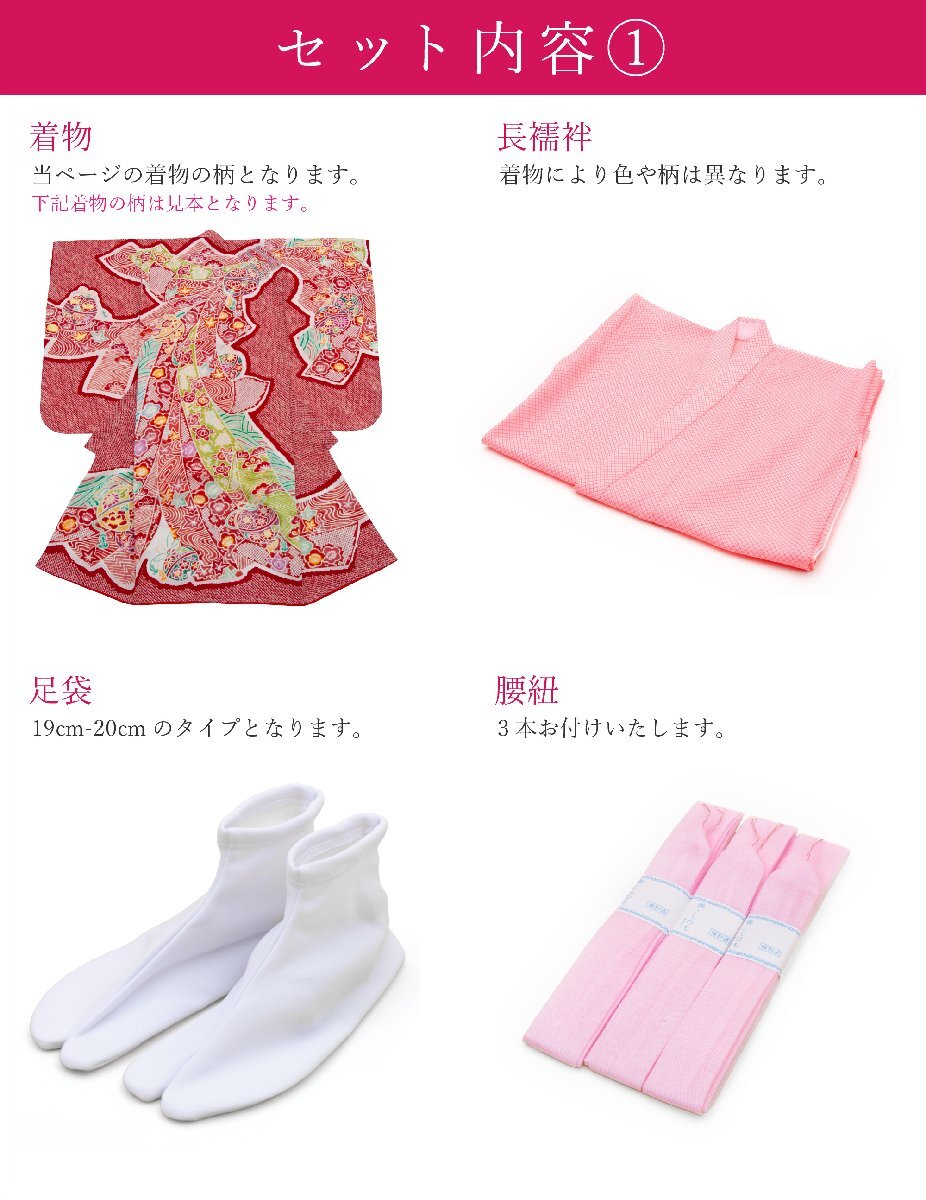 | 商品説明 | 着物・重ね衿・長襦袢・結び帯・草履・バッグ・筥迫・末広・帯締め・かんざし・帯揚・しごき・足袋・子供用腰紐3本が付いたフルセットです。 |