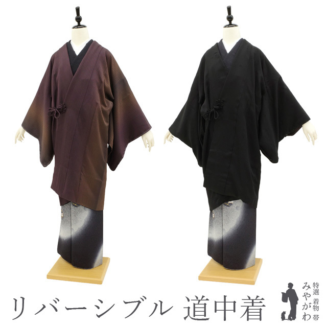 道中着 コート 未使用 正絹 袷 リバーシブル 茶系ぼかし 黒 新古品 仕立て上がり 身丈98 裄丈67 Mサイズ ハオリモノ みやがわ sb16247