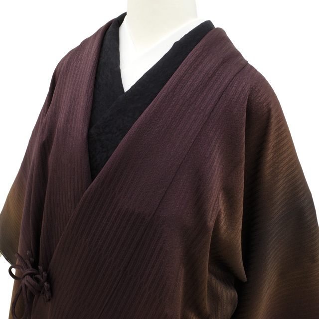 【新古品】 道中着 コート 未使用 正絹 袷 リバーシブル フォーマル 茶系ぼかし 縦ぼかし 黒 草花 地紋 カジュアル 和装コート 新古品 仕立て上がり ハオリモノ 身丈98 裄丈67 Mサイズ ハオリモノ みやがわ sb16247