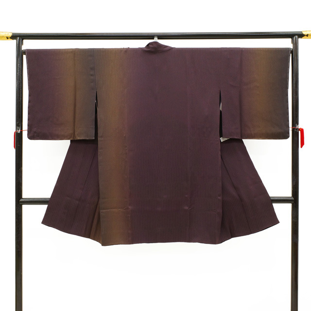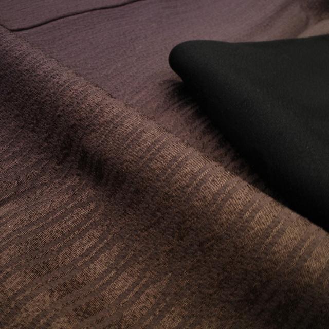 一面は、ほんのり紫がかった深みのあるこげ茶と、黄色味を帯びたやわらかなこげ茶が縦にぼかされ、変わり縞の地紋がさりげなく表情を添えています。
