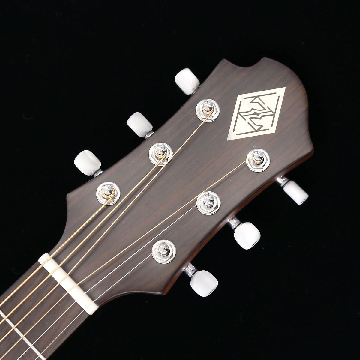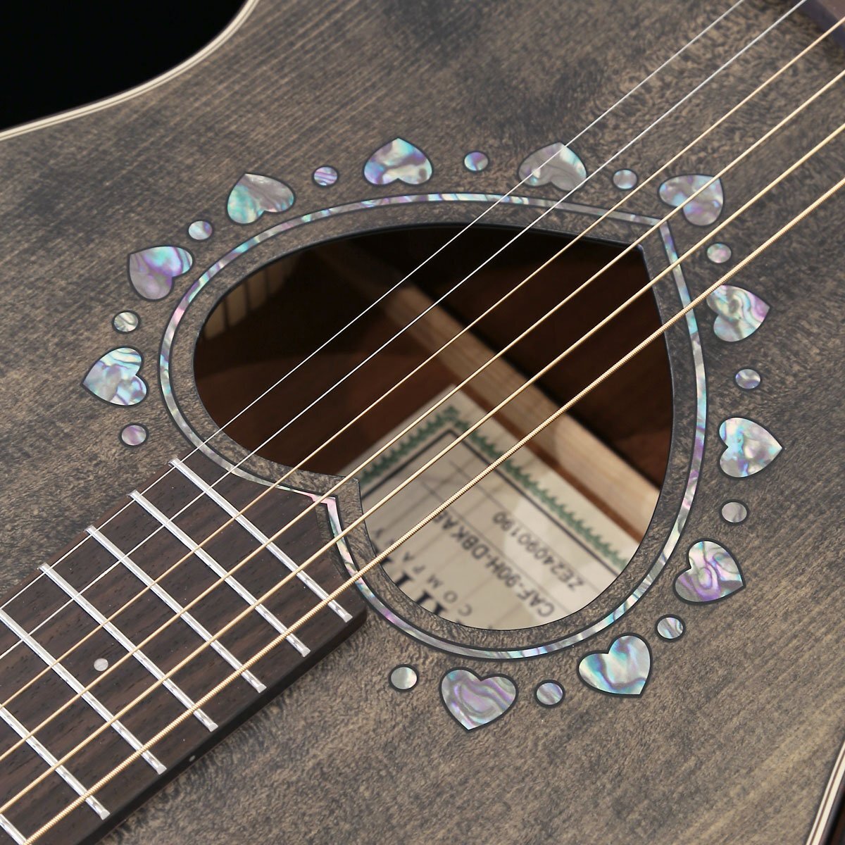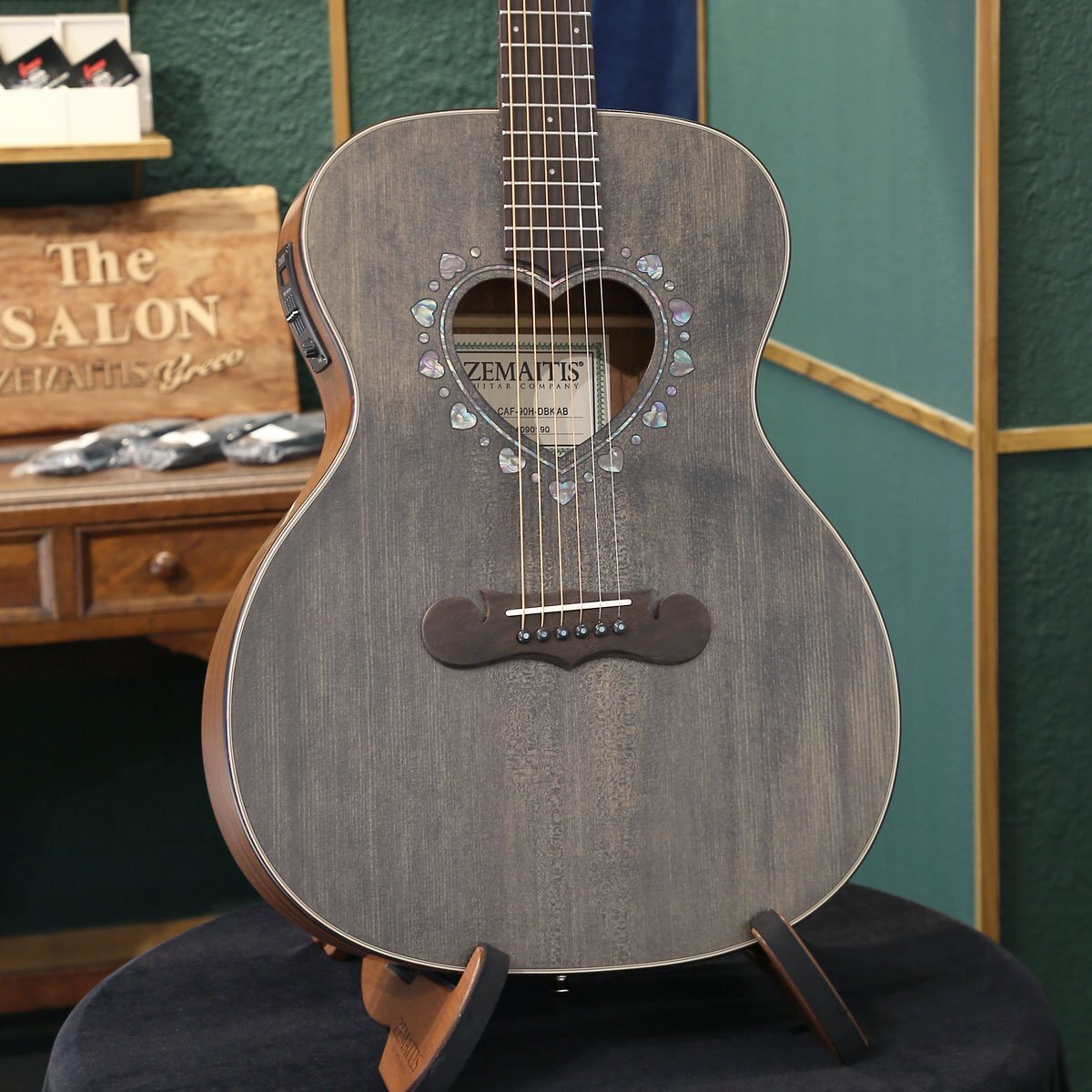 ゼマイティス・アコースティックよりアンダーサドル・ピックアップを搭載したオーケストラ・サイズのエレクトリック・アコースティック・モデルのCAF-90Hに、アンティーク・フィニッシュのデニム・ブラック・トップとフォレスト・グリーン・トップの2カラーが登場しました。 それぞれアバロン柄とマザー・オブ・パール柄のロゼッタをラインナップしています。 CAF-90Hは、マザー・オブ・パールのダイヤモンド・インレイが輝く特徴的なヘッドストックを持ったマホガニー・ネックに、ローズウッド・フィンガーボードを採用した20フレット仕様の14フレット・ジョイントとなっています。 ゼマイティスの伝統的なハート型のサウンドホール、その周縁に施されたハートをちりばめたロゼッタ、マスターシュ・ブリッジのオリジナル・デザインは、非常に魅力的です。 トップ・ブレイシングはサウンドホールの形状やボディーのサイズを考慮して、最大限の鳴りを引き出すためにフォワードXブレイシングを採用しています。 ボディー・トップは板材の時に真空状態で熱を加えることで余分な水分やミネラルを取り除いたソリッド・スプルースを使用し、サイドとバックにはサペリを用いて狂いの出にくい安定したボディー剛性を実現しました。 ヘッドストックの突板にはローズウッドを使用し、ペグのボタンはパーロイドを採用しています。 ボディー・サイドには4バンドEQとクロマティック・チューナー機能を持ったプリアンプを搭載し、お好みのトーンでアンプなどの外部機器に出力できます。 ●アンダーサドル・ピエゾ・ピックアップからのサウンドをコントロールするプリアンプ・システム。 コントロールはVolume、Treble、Middle、Bass、Presence。 便利なチューナー機能も装備。 9Vバッテリーを使用。 ●サウンドに広がりを与えるハート形状のサウンドホールと、ハートとドットが交互にちりばめられたアバロン柄のロゼッタ。 ●その形状から、英語で口ひげを意味する「マスターシュ」と命名されたブリッジ。 ●付属ギグバッグは、大きな前面ポケット付き。 ダブル・ショルダー・ストラップ でバックパック・スタイルでの運搬が可能。 SPEC ■Top: Solid Spruce ■Back & Sides: Laminated Sapele ■Bracing: Forward X ■Neck: Mahogany ■Nut Width: 43mm ■Fingerboard & Bridge: Rosewood ■Fretboard Radius:400mm ■Nut & Saddle: Bone ■Scale Length: 630mm ■Frets: 20 ■Headstock Veneer: Rosewood ■Finish: Satin Urethane ■Body Length: 490mm ■Body Width (Upper Bout):282mm ■Body Width (LowerBout): 392mm ■Body Depth (Upper): 96mm ■Body Depth (Lower): 108mm ■Preamp: EX-4 with Zemaitis Logo ■Strings: .012 / .016 / .024 / .032 /.042 / .053 [Coated Phosphor Bronze] ■Case: Gigbag |