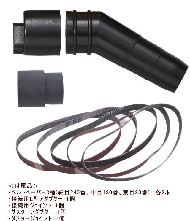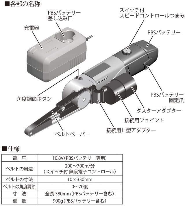 | 仕様・規格 | <仕様> ■用途:木、金属の仕上げ・バリ取り作業など、狭い部分の加工に ■電圧:10.8V(PBSバッテリーLi/A2専用・リチウムイオン電池) ■ベルトの周速:200~700m/分 (無段電子コントロール付き) ■ベルト寸法:10×330mm ■角度調整機能:0度~70度 ■機体寸法:長さ380mm(バッテリー含む) ■重量:900g(バッテリー含む) ■充電時間:90分 ■駆動時間(フル充電時):約20分(目安) <付属品> ・専用ブローケース:1個 ・専用バッテリー(PBSバッテリーLi/A2):1個 ・専用充電器LG/A2:1個 ・ベルトペーパー3種(細目240番、中目180番、荒目80番) :各2本 ・接続用L型アダプター:1個 ・接続用ジョイント:1個 ・ダスターアダプター:1個 ・ダスタージョイント:1個 |
