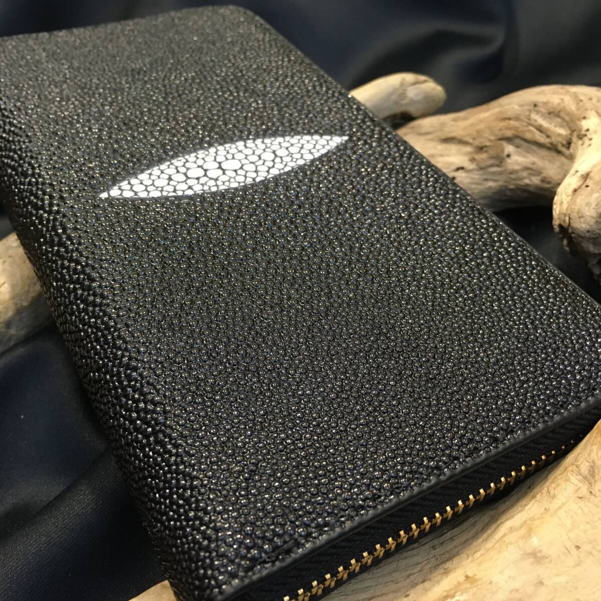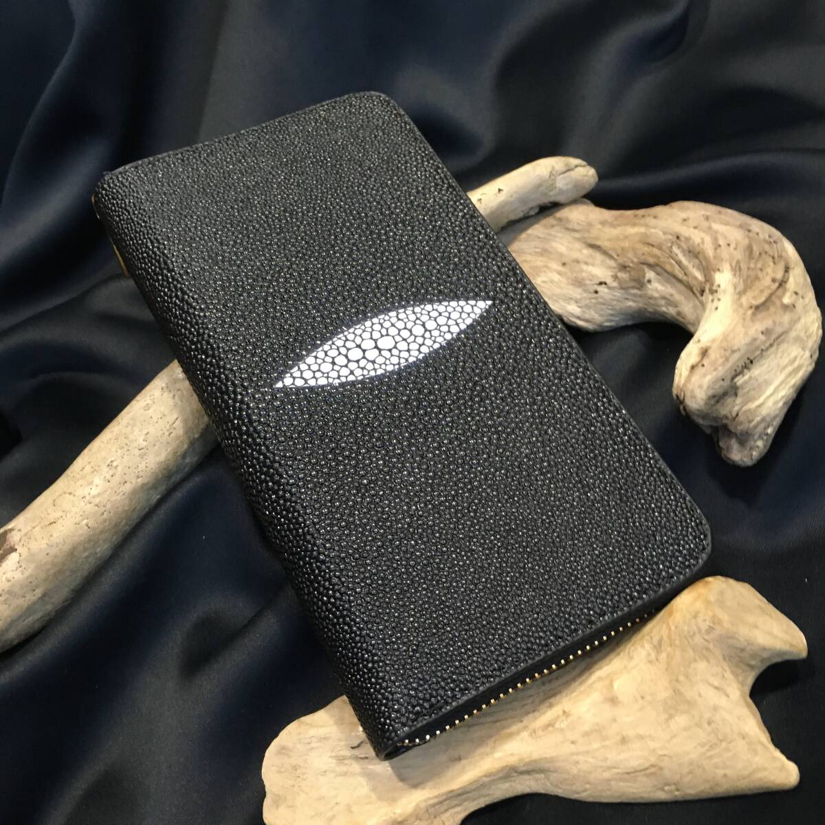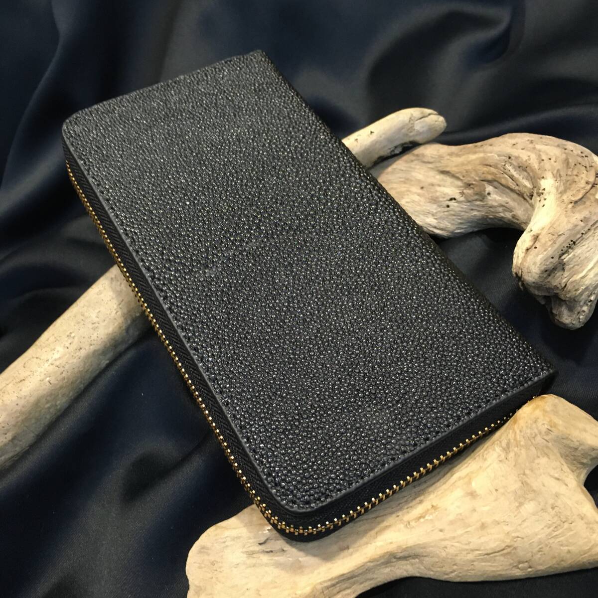 新品 本革レザー ラウンドファスナー長財布 エイ型押し メンズ ロングウォレット スティングレー スターマーク 金運 開運 ブラック 黒 95