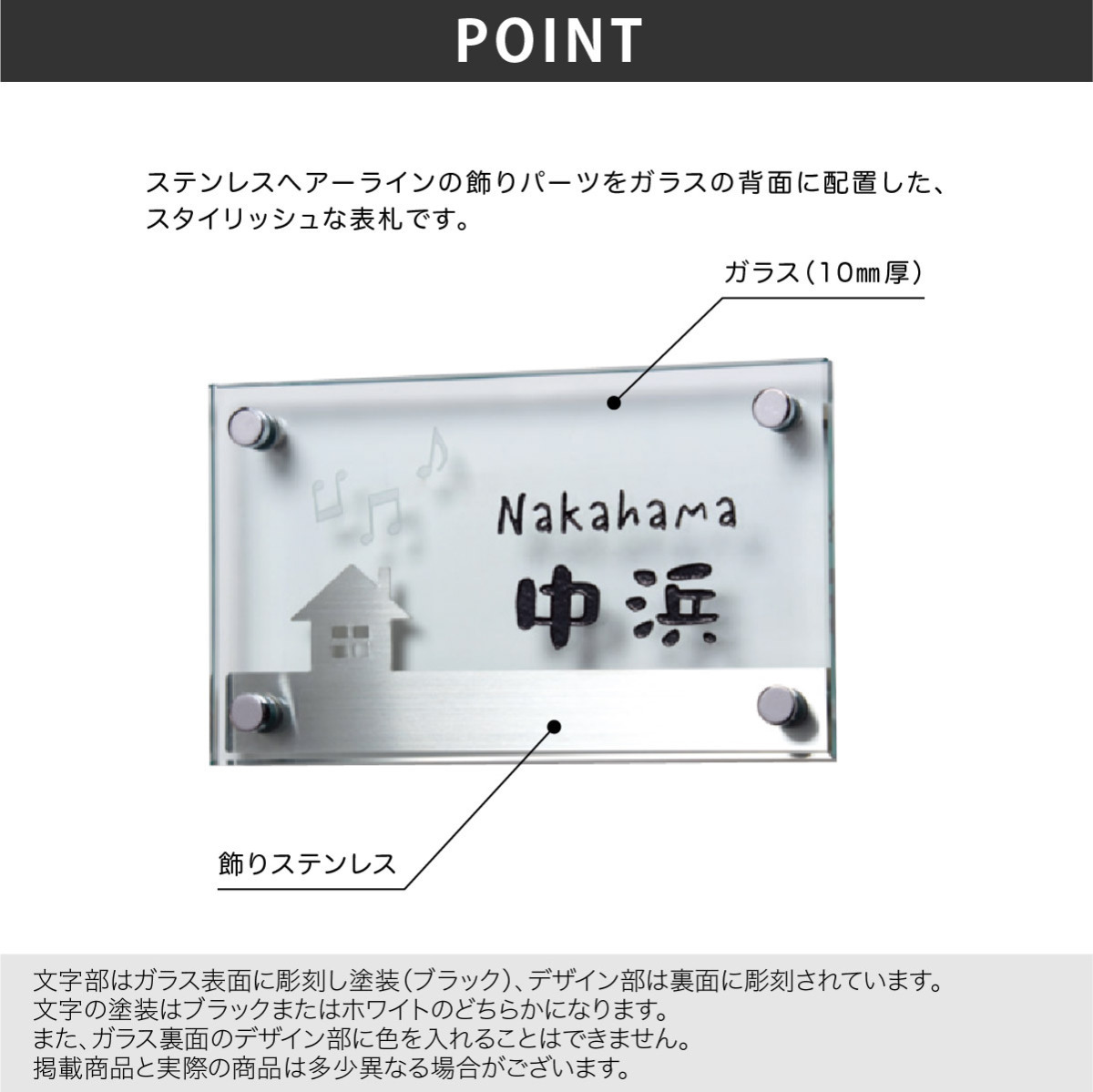 商品詳細 | ステンレスヘアーラインの飾りパーツをガラス背面に配置した スタイリッシュな表札です。 文字部はガラス表面に彫刻し、デザイン部は裏面に彫刻いたします。 文字色はブラックまたはホワイトどちらかお選びいただけます。 |