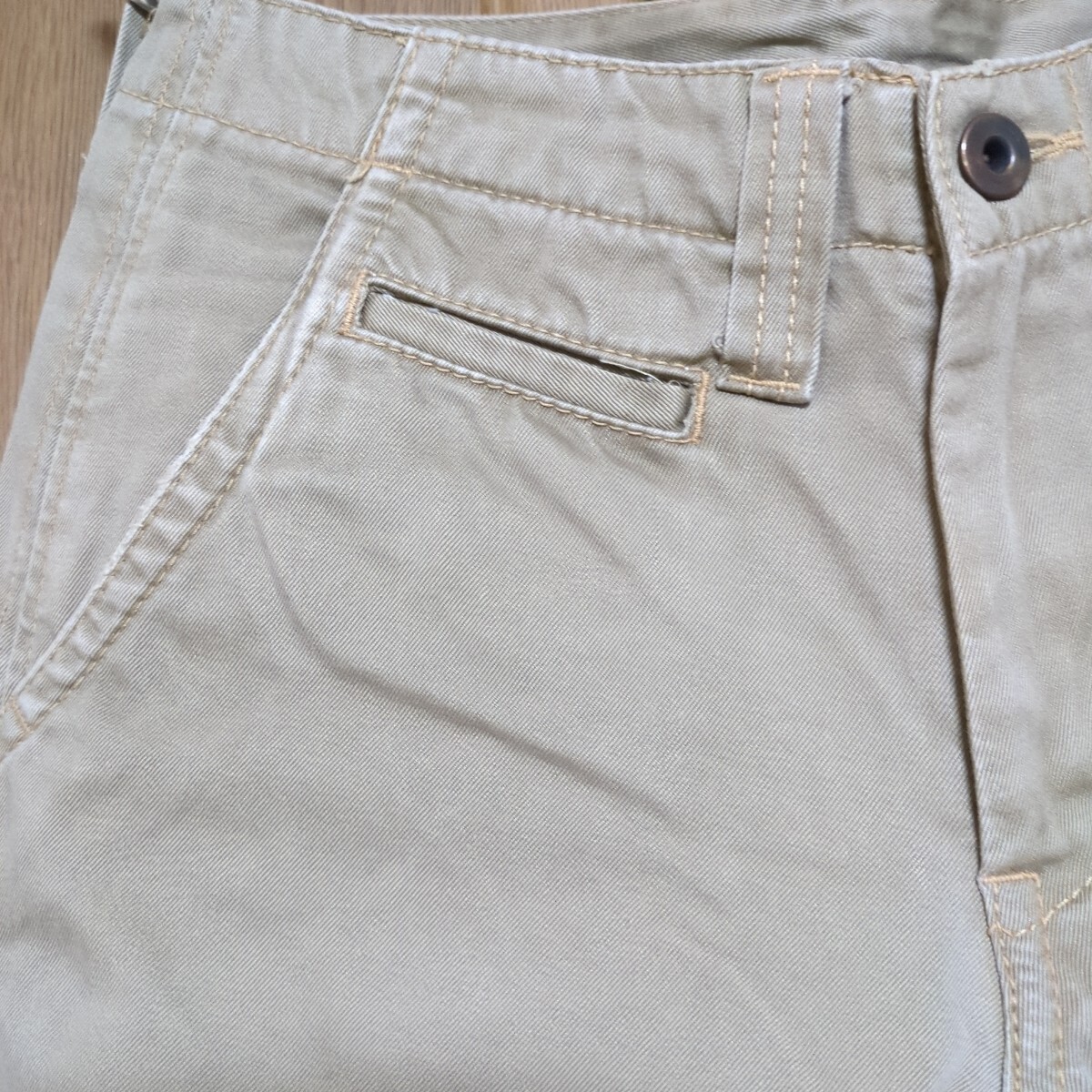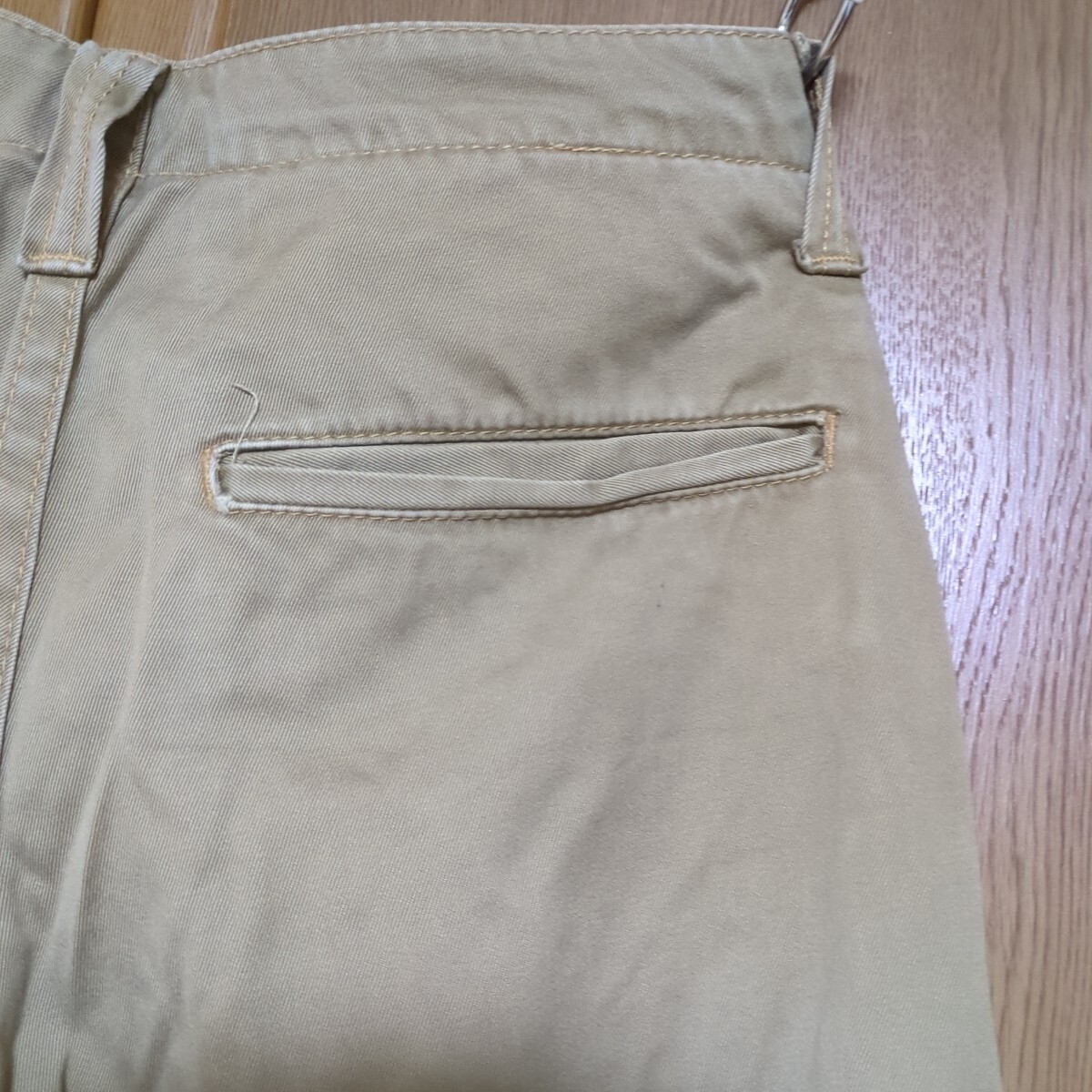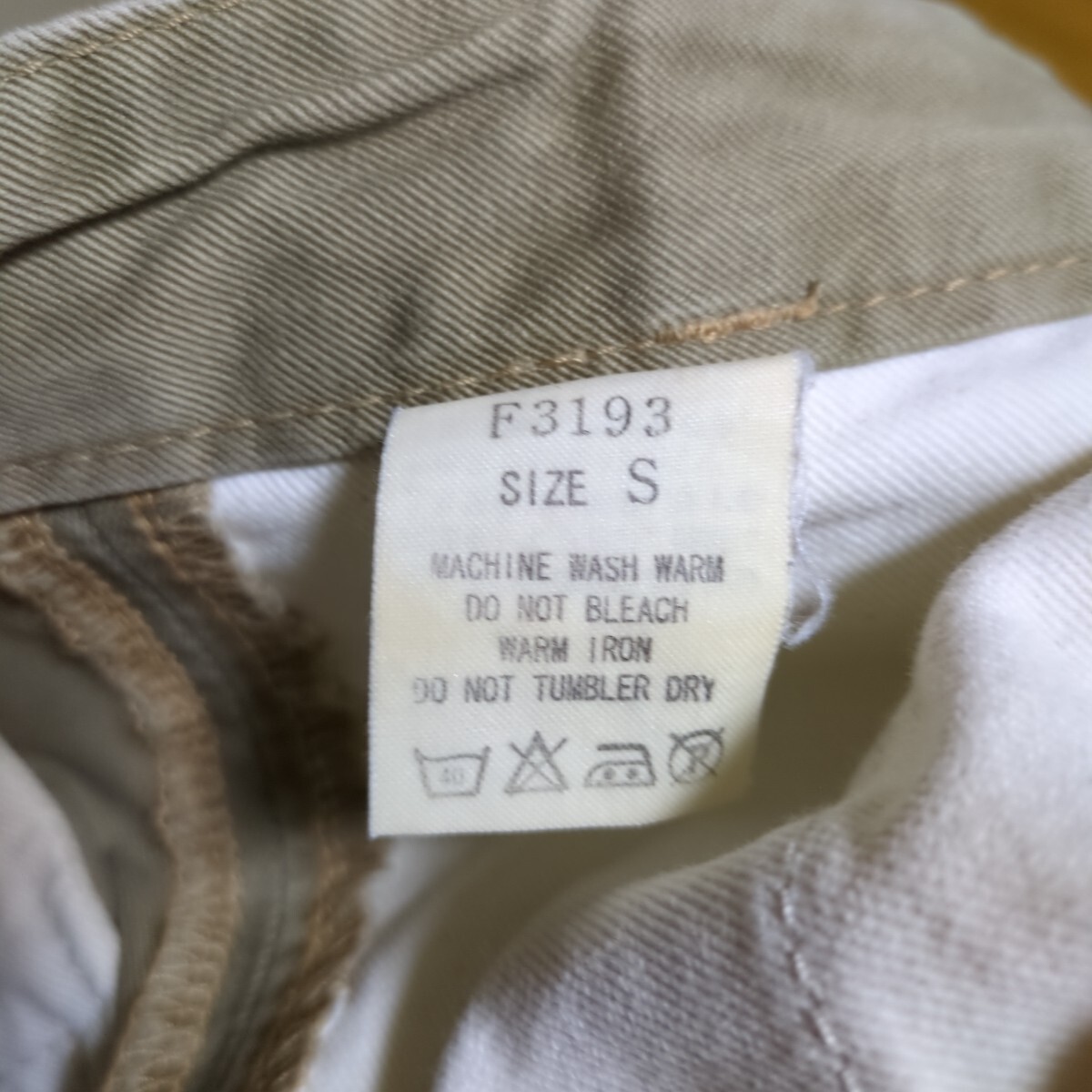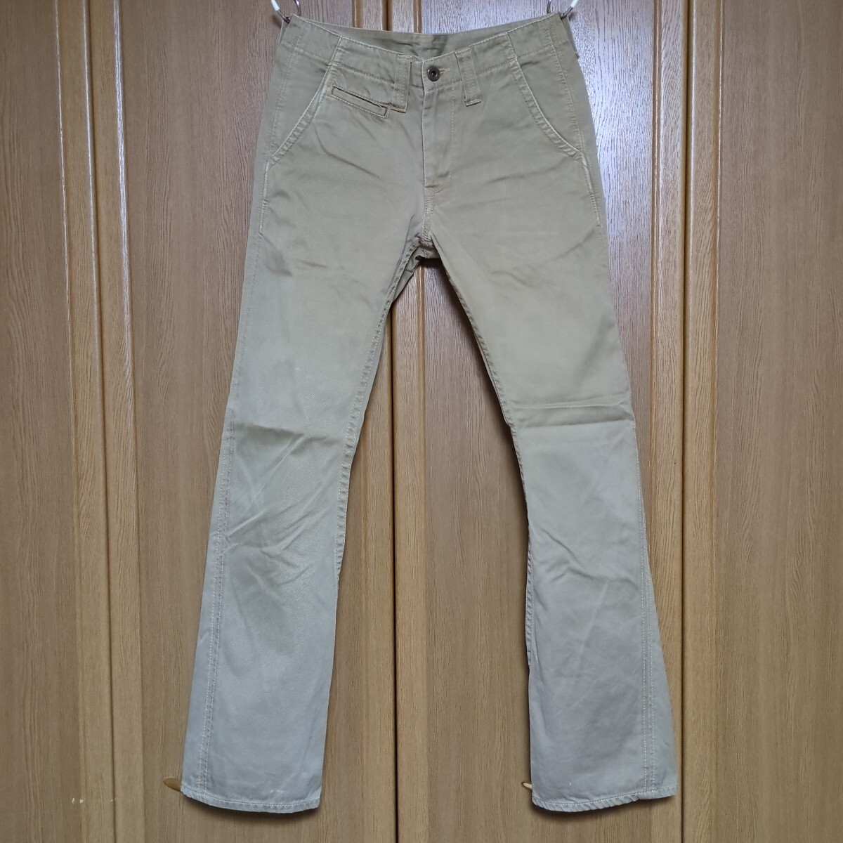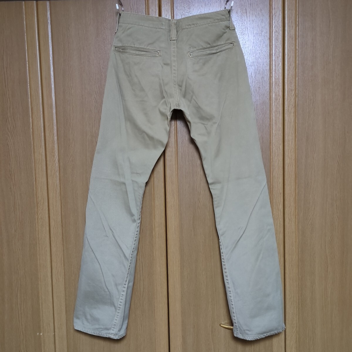 日本製、スタジオエクル社製(FOBでおなじみのメーカーです)のチノパンです。コットンしっかりしたいい生地です。若干の使用感、擦れございますが、特に大きなダメージも無く、まだまだ着用して頂けるかと思います。あくまでもUSED品になりますので、神経質な方、古着のご理解のない方、不慣れな方の入札お断りです。サイズは、メーカー表記Sで、平置き採寸で、ウエスト38センチ、股下78センチ、前股上24センチ、太もも辺り24センチ、裾幅21センチです。素人採寸ですので多少の誤差はお許しください。