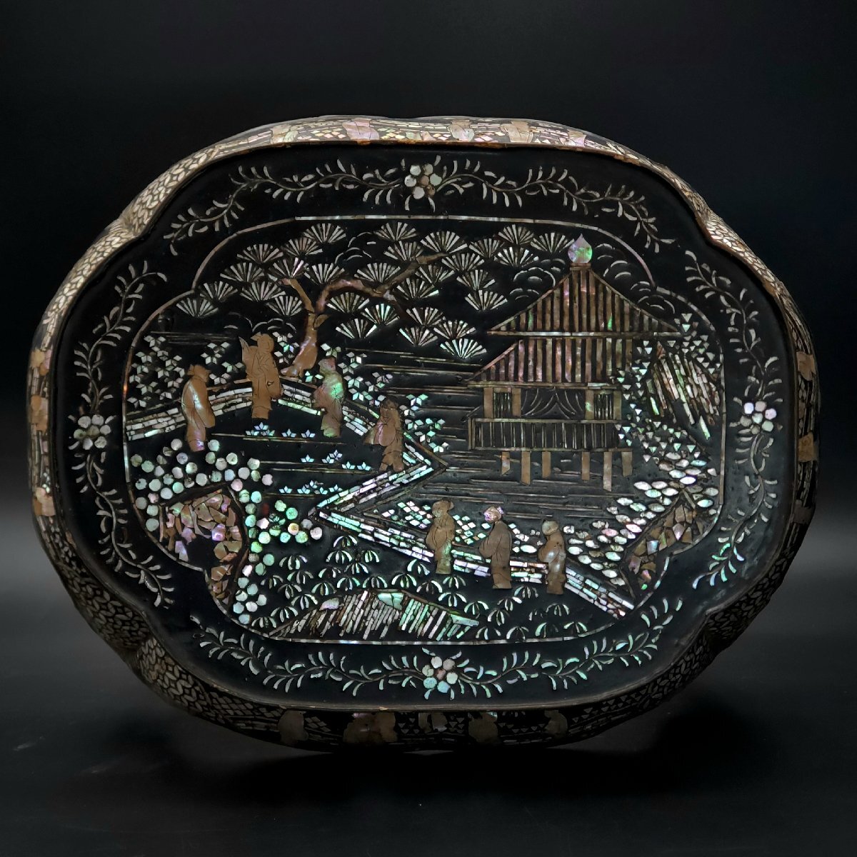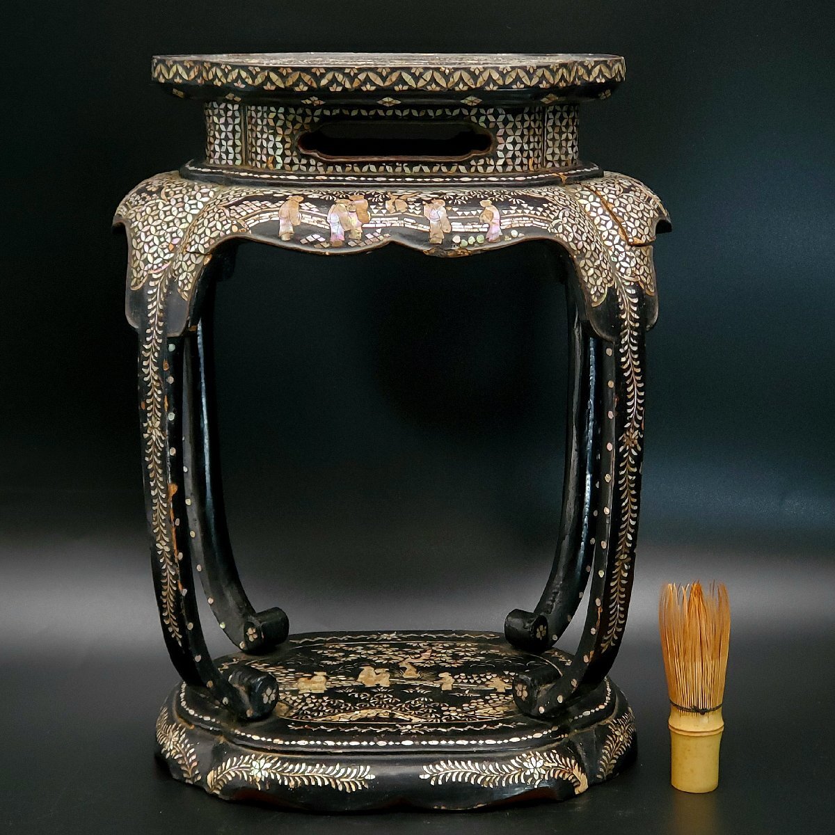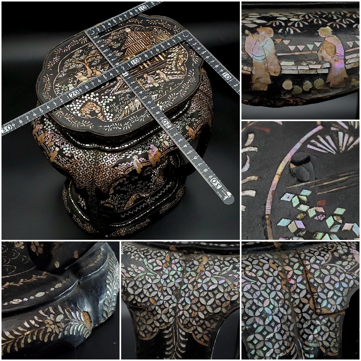 【商品説明】:年代物のため全体的に経年による螺鈿の傷みがあり、足部分に割れなどダメージがございます(写真10枚目)。古いお品ですので画像にて状態をご確認いただき十分ご納得の上で入札をお願いいたします。