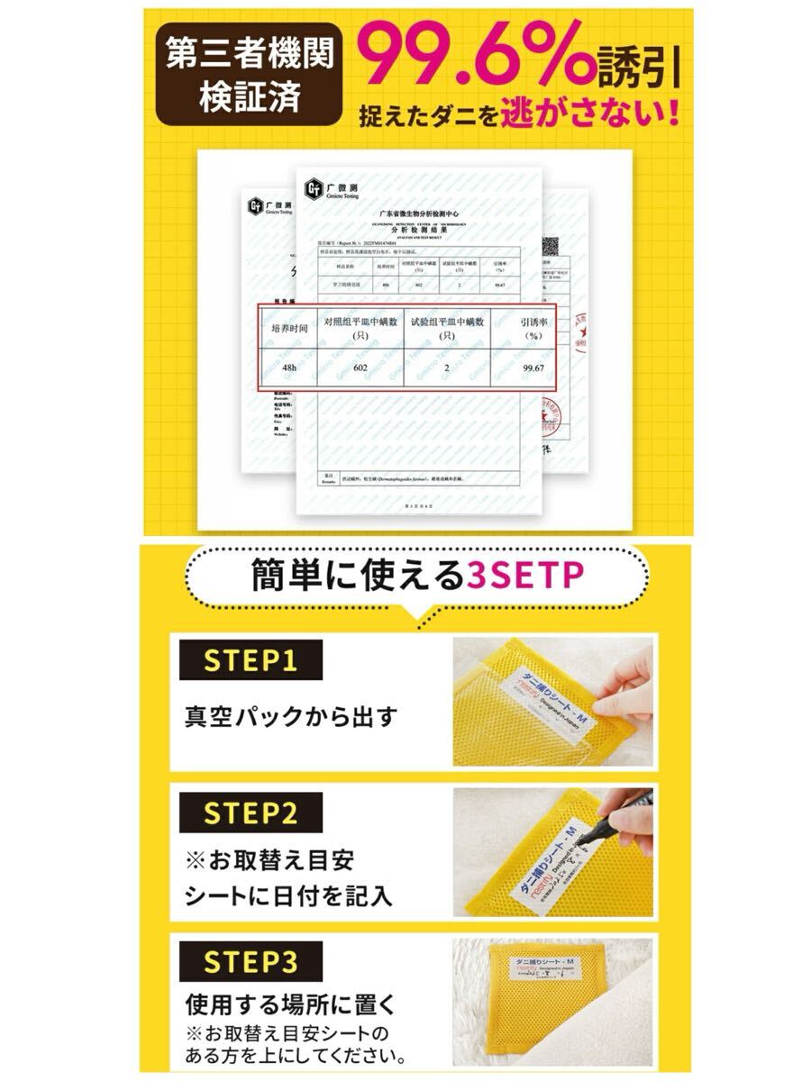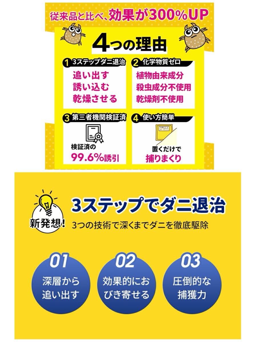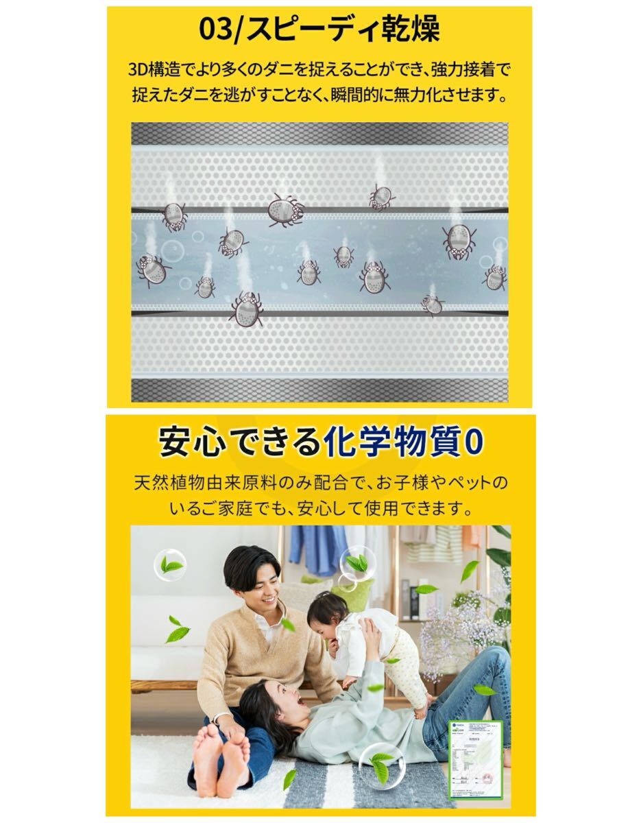 ダニが好む香りで誘い寄せ、粘着剤で捉えたダニを逃がすことなく、瞬間的に無力化させます。