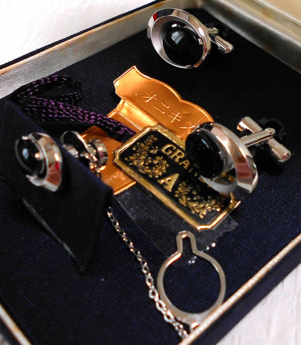 サイズ:タイピンの幅1cm、縦1.2cm。カフスボタンの幅2cm、縦1.5cm。