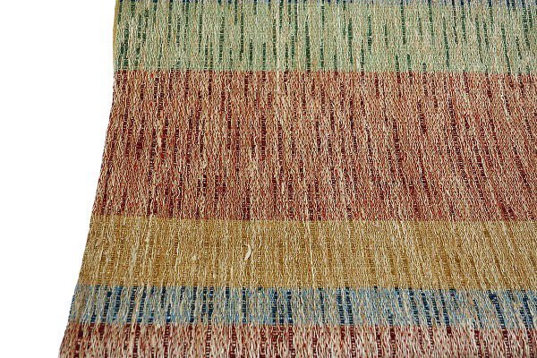 数色の横段に織り分けられた洒落袋帯です。 透かし織りのような雰囲気の、組織で柄があしらわれております。 お洒落着物に合わせてお楽しみください。 |