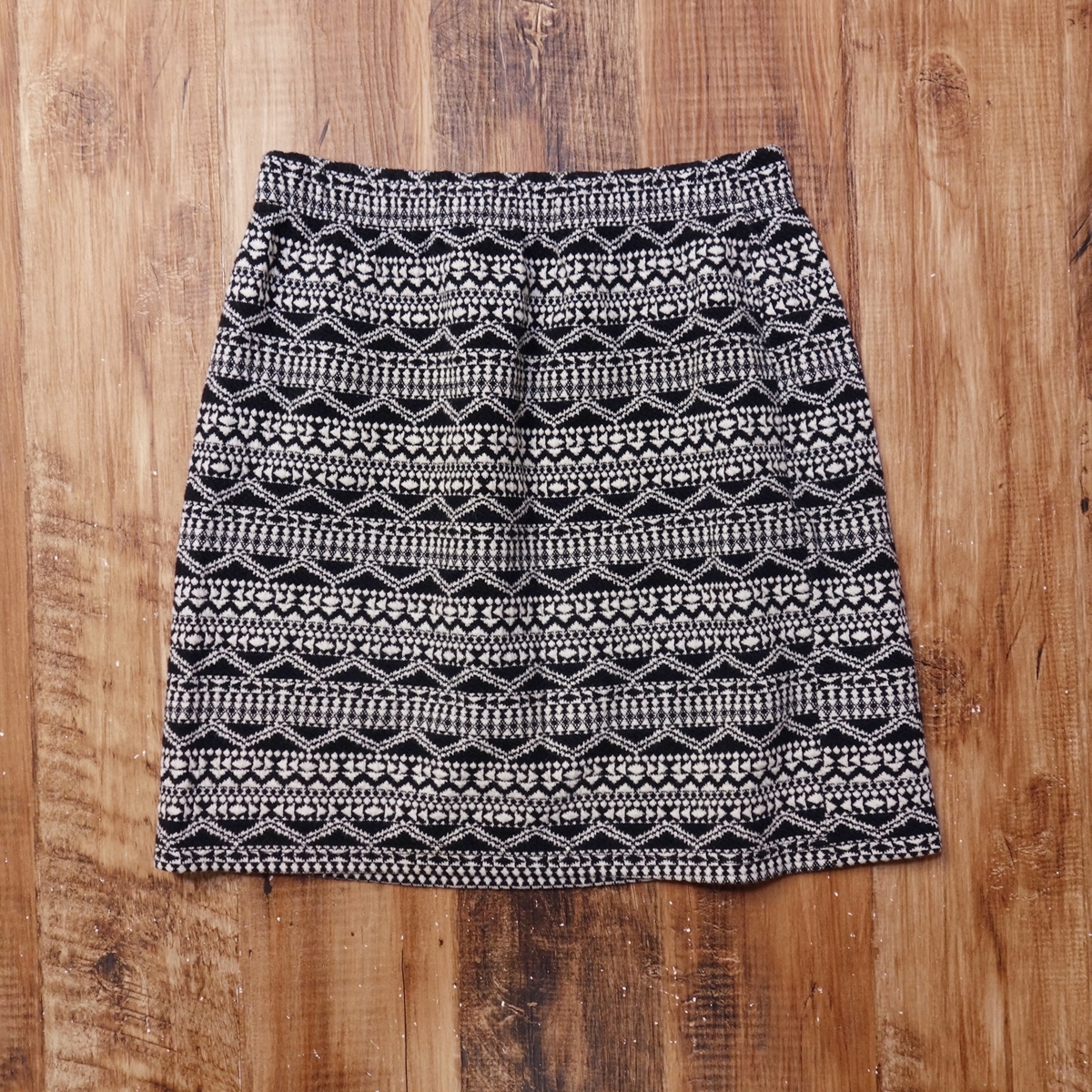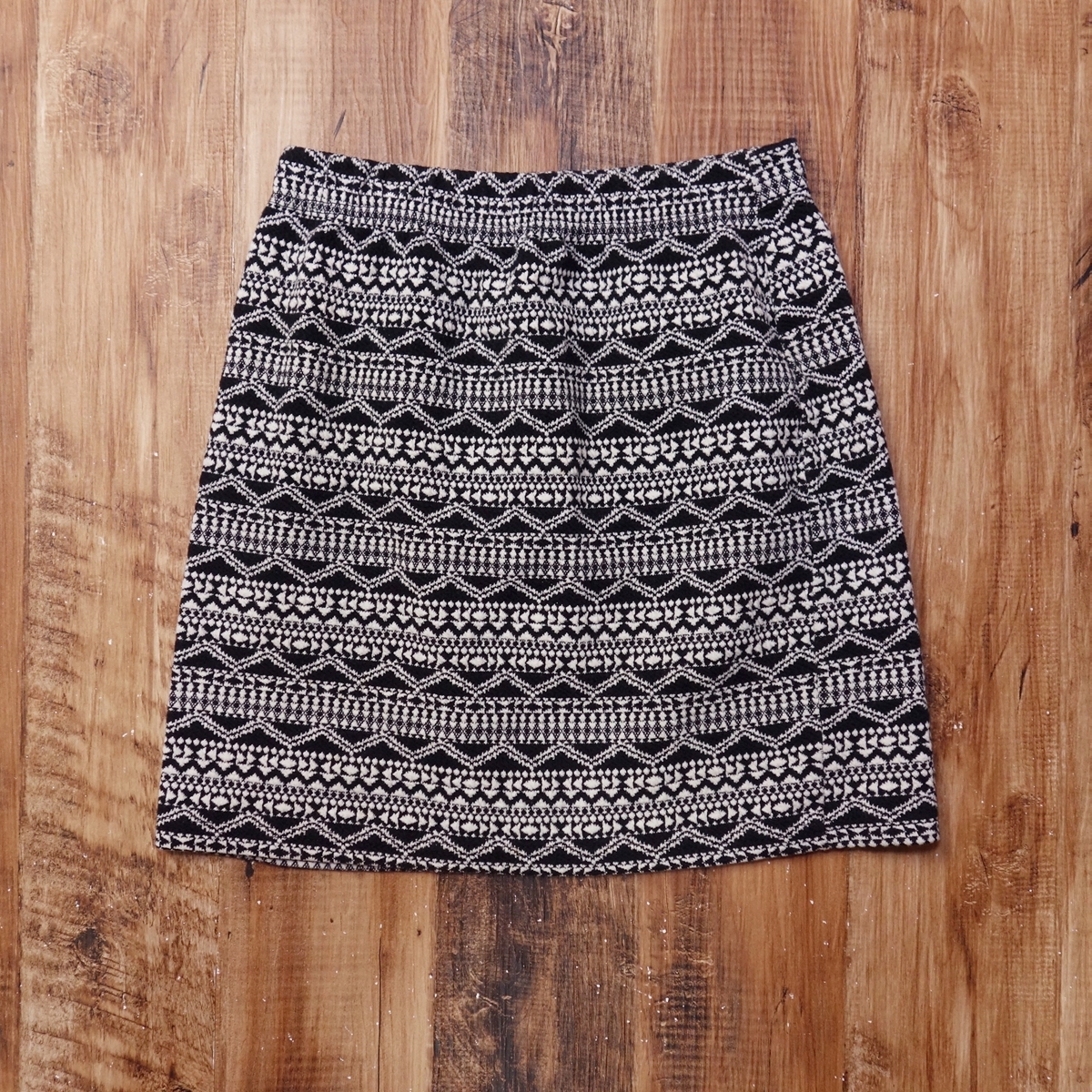 美品 ジャガードニットミニスカート レディース フェアアイル ボヘミアン フリーサイズ ブラック系×アイボリー系 幾何学柄 LA5