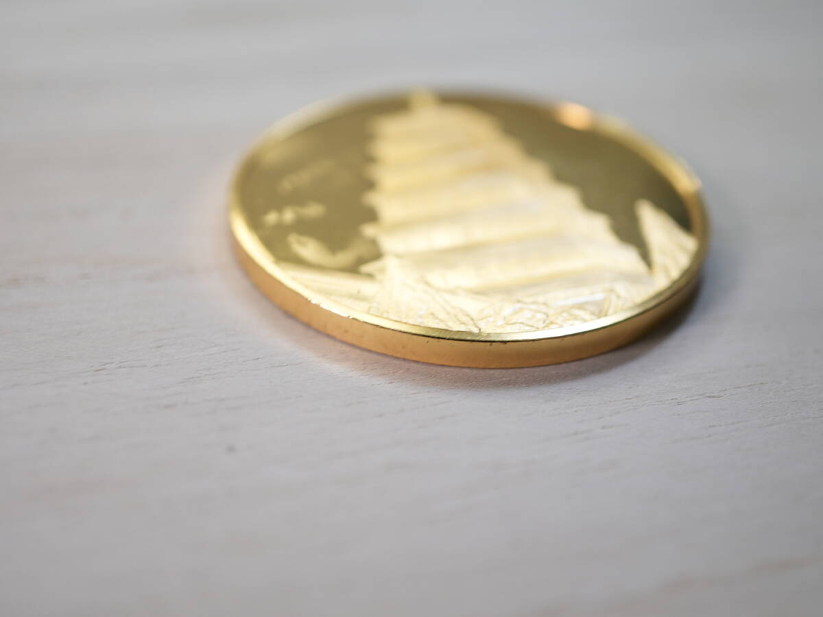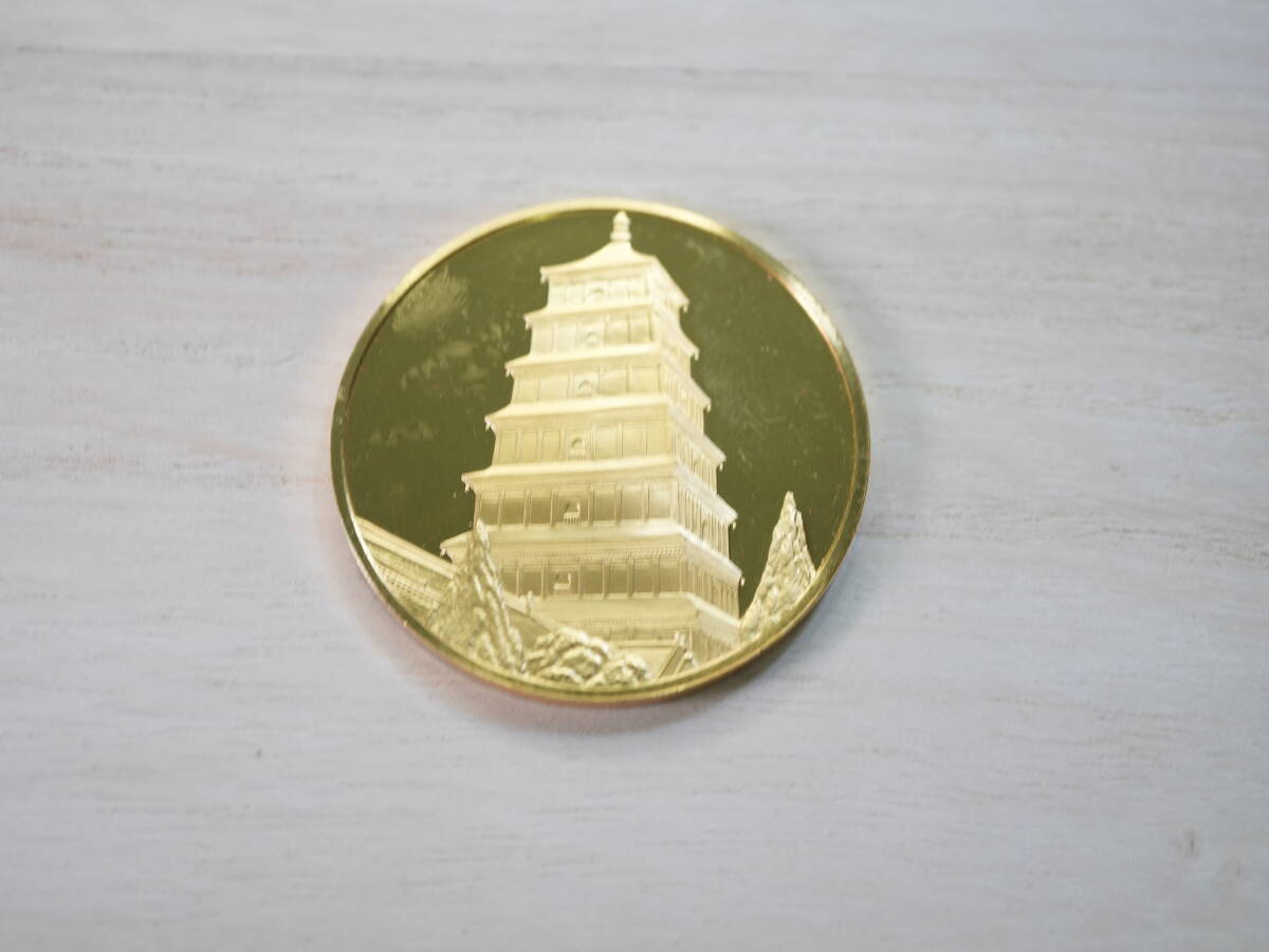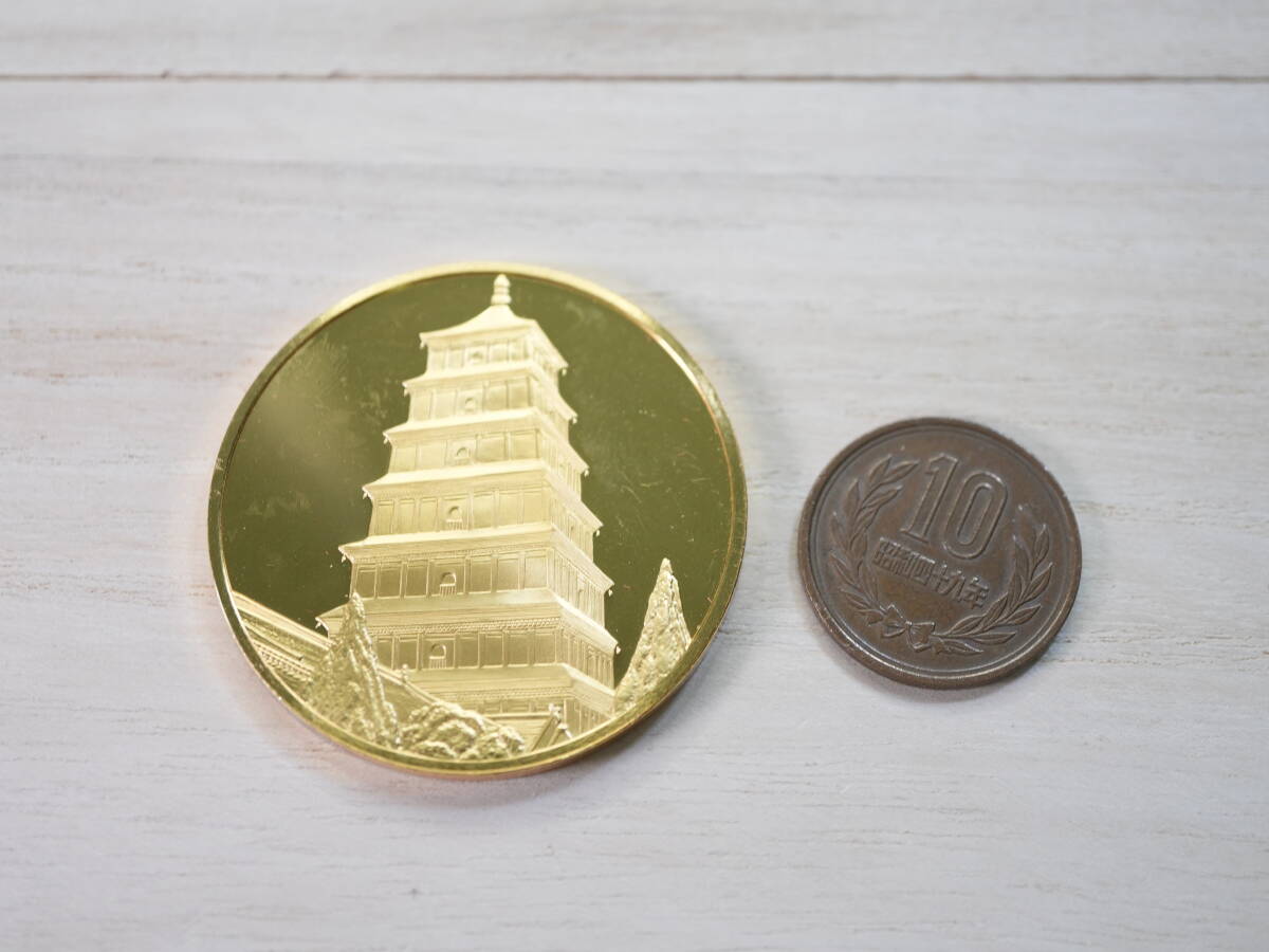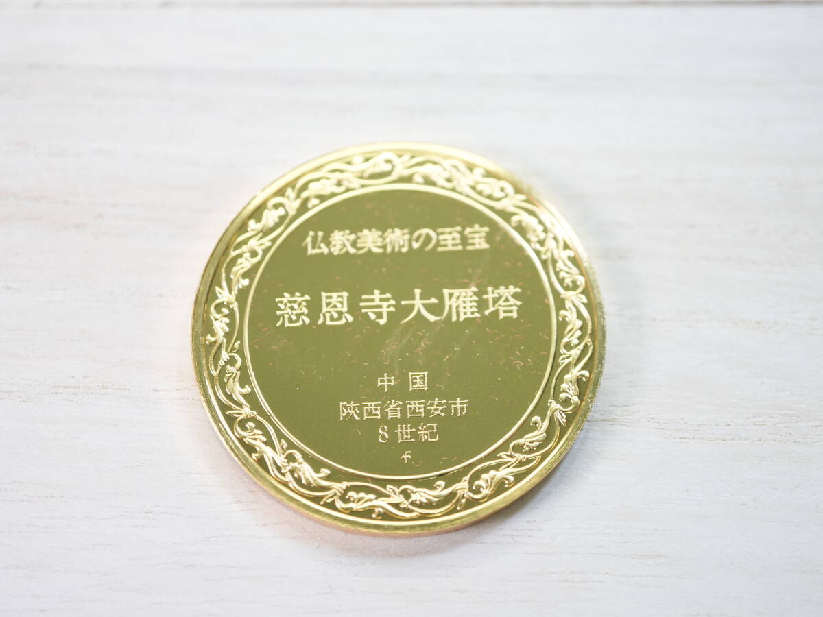 昭和60年に数量限定で発売されたメダルでして、中国の唐時代・長安年間に建立されたと言われております慈恩寺大雁党でございます。 4.5センチ × 4.5センチ 重さ約33グラム、鏡面仕上げ、純金の美しいメッキのメダルにございます。 40年以上前のものでございますゆえ、表面に変色や若干のスレが認められる箇所がある場合がございますが、深い傷やメッキの剥げなどは見受けられない次第にございます。 純金仕上げのメダルの出品で有りがちな画像の加工などは一切行っておりませんので、真実の状態を掲載しております。 可能な限り同梱致しますゆえ、ご希望の方はその旨を落札後にメッセージにてお伝えいただきたく存じます。 |