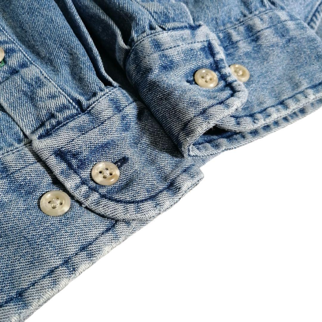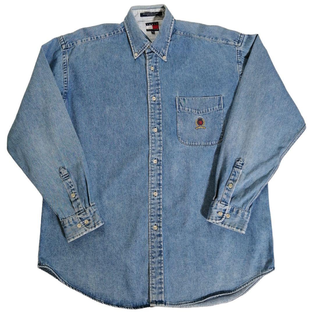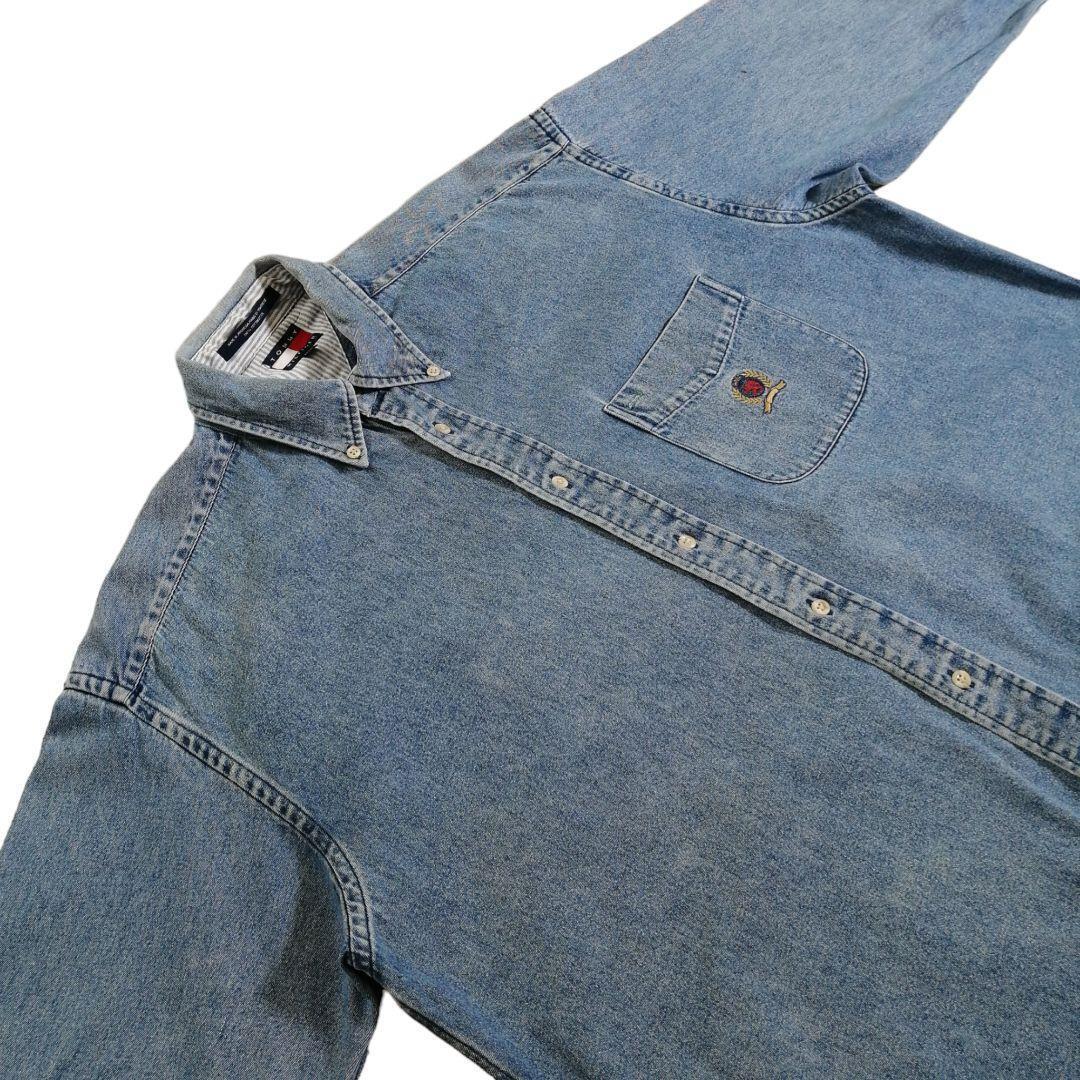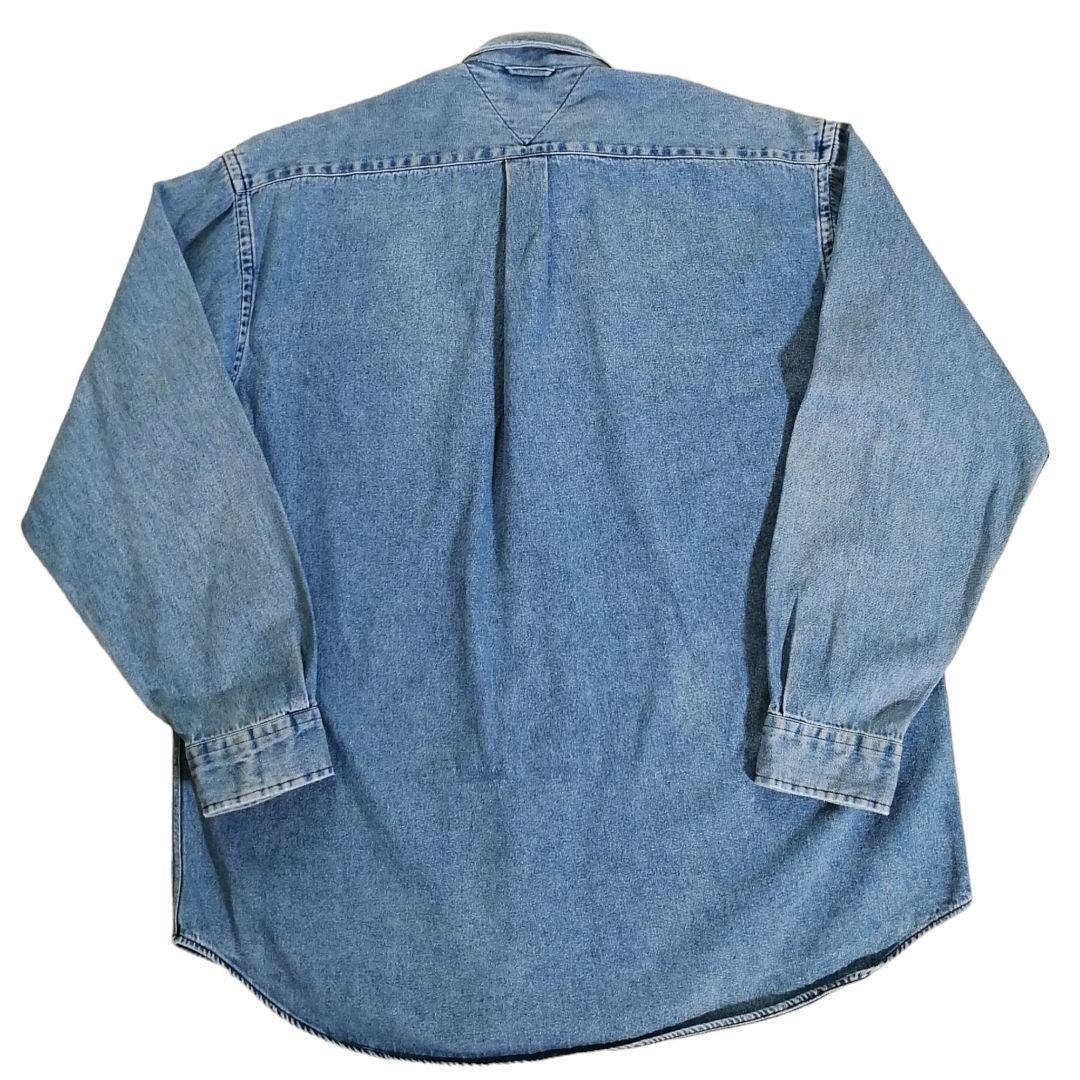 90s TOMMY HILFIGER トミーヒルフィガー デニムシャツ 長袖シャツ 刺繍ロゴ ブルー メンズ M オーバーサイズ 古着 2870