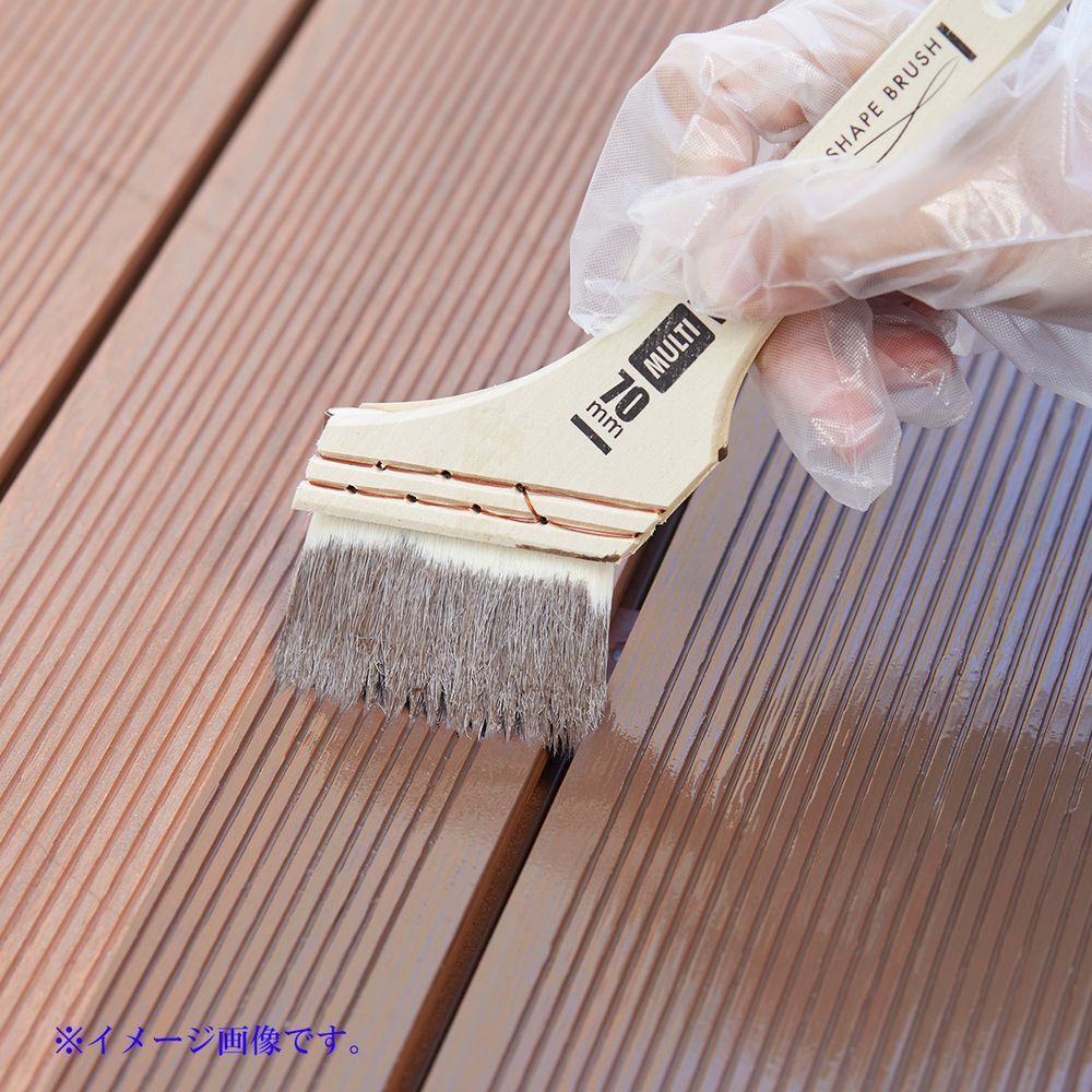 ●塗装する人工木の色や吸い込みの度合によって仕上がりの色・乾燥性などが大きく左右されますので、あらかじめ目立たないところ、または同種の人工木で試し塗りをして、仕上がりの色・乾燥性などを確かめてから塗って下さい。