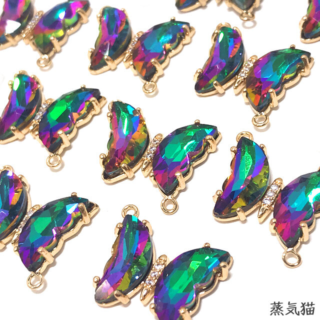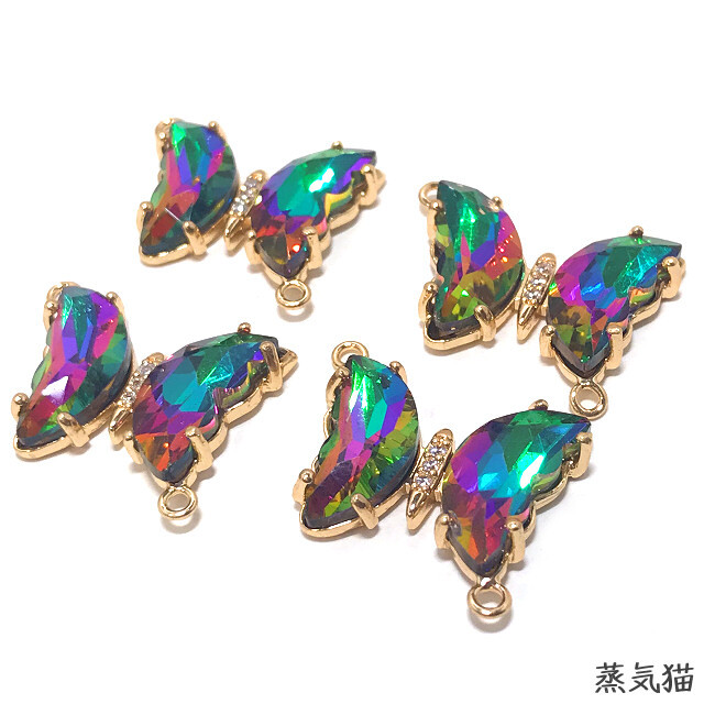 c6168【コネクター】蝶々ガラスチャーム ミスティックカラー4個【蝶 幻想 ピアス ハンドメイド用アクセサリーパーツ素材】蒸気猫パーツ