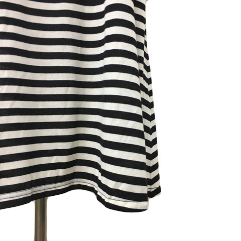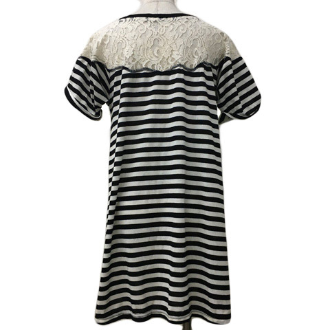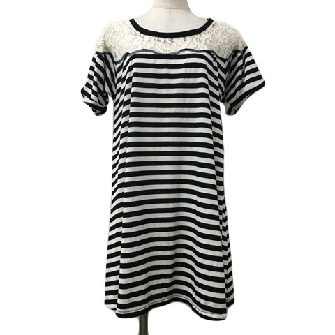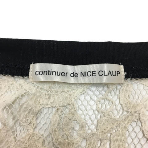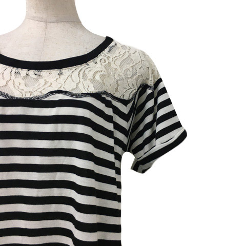 ナイスクラップ NICE CLAUP continuer de カットソー プルオーバー チュニック ラウンドネック 切替 レース Aライン ボーダー 半袖 黒 白