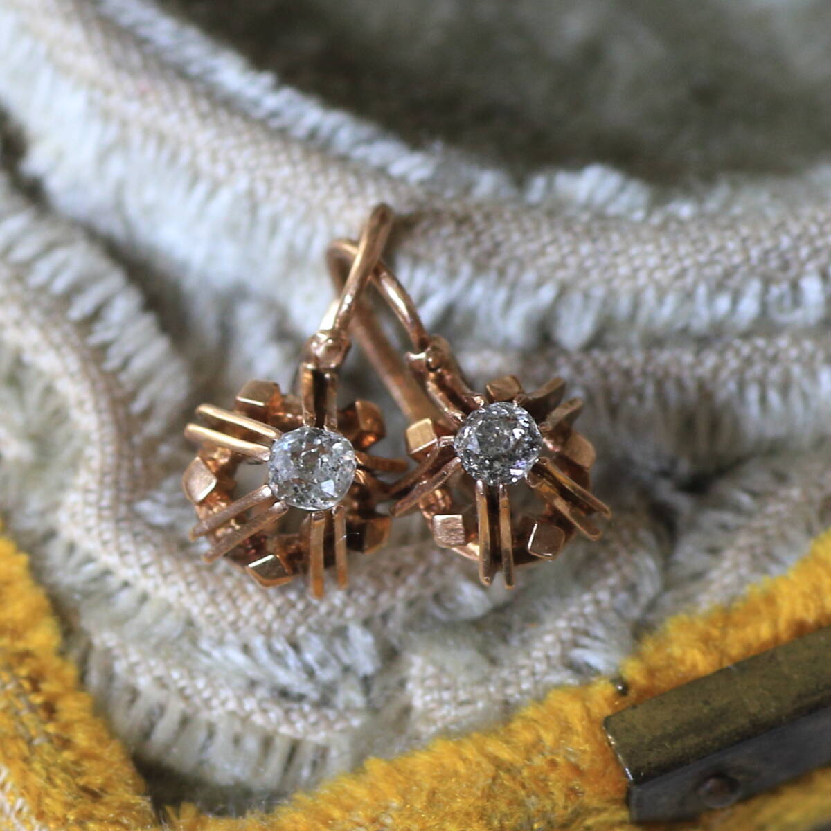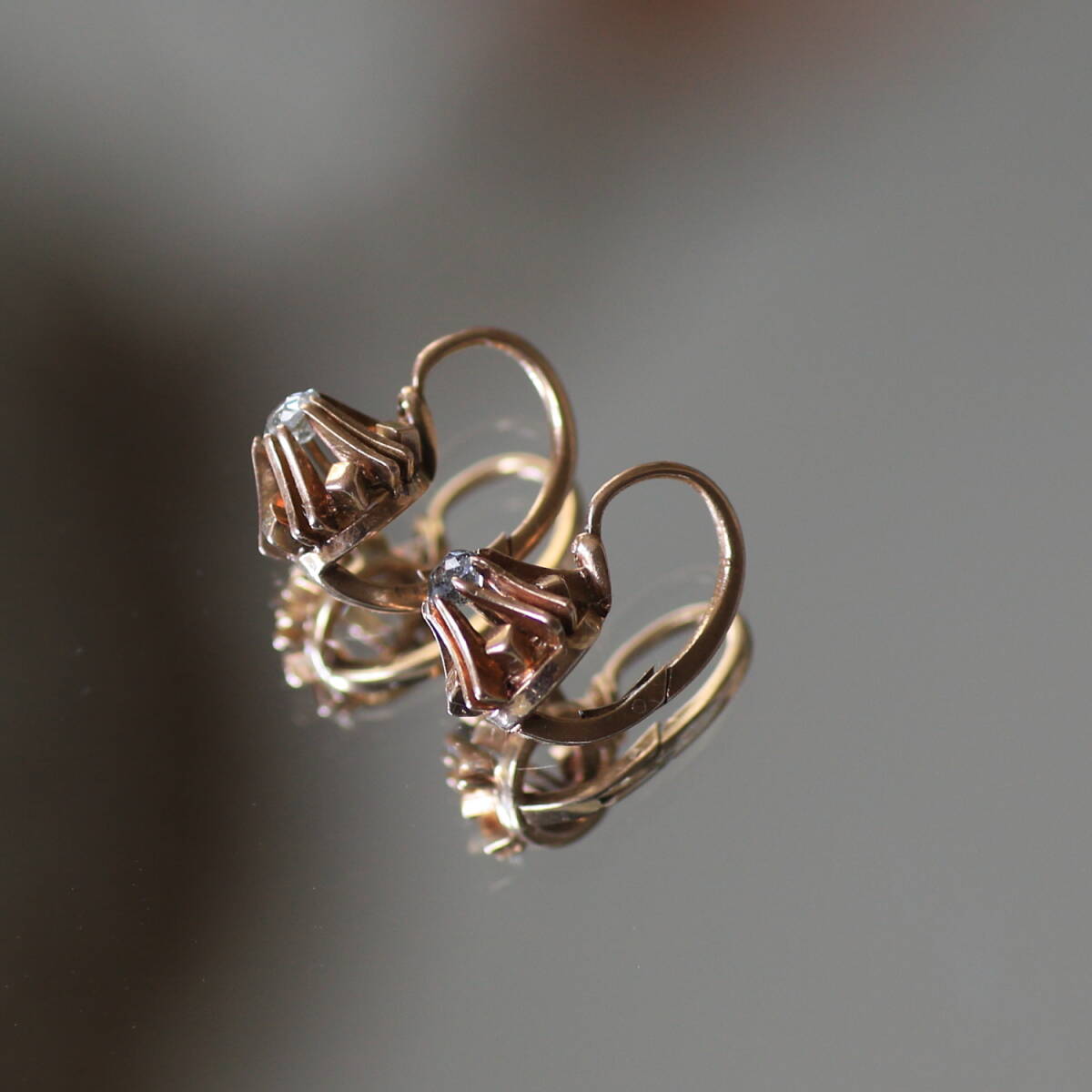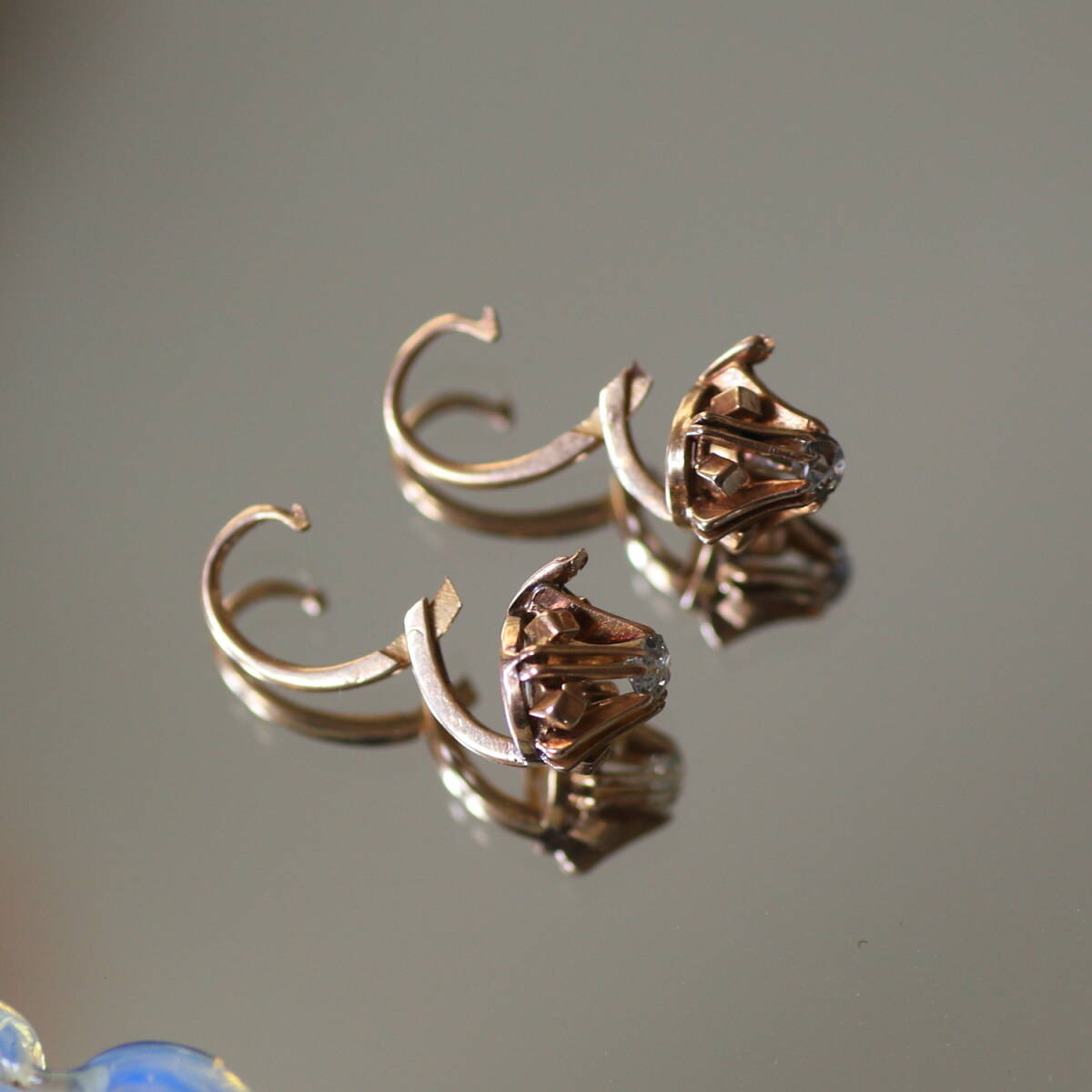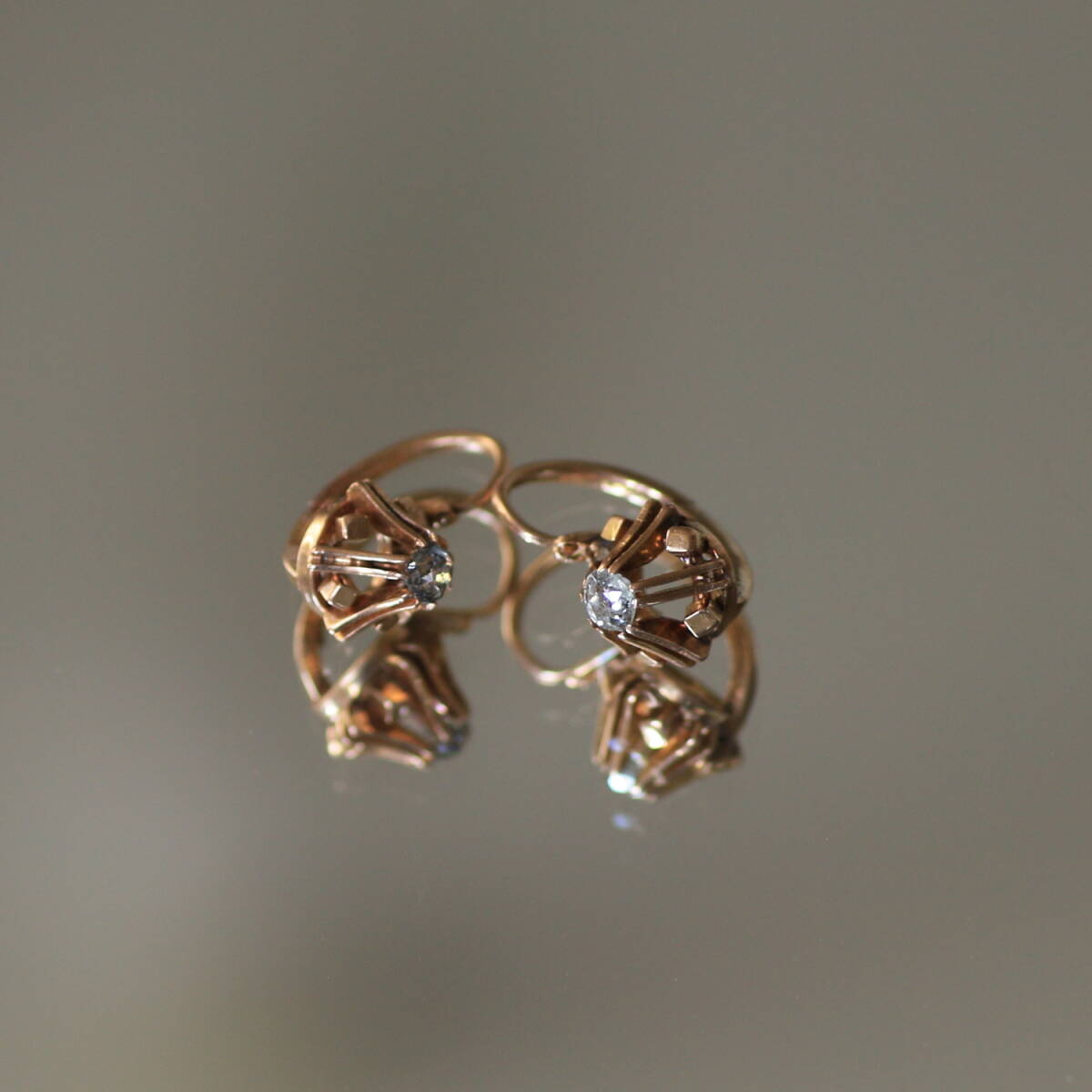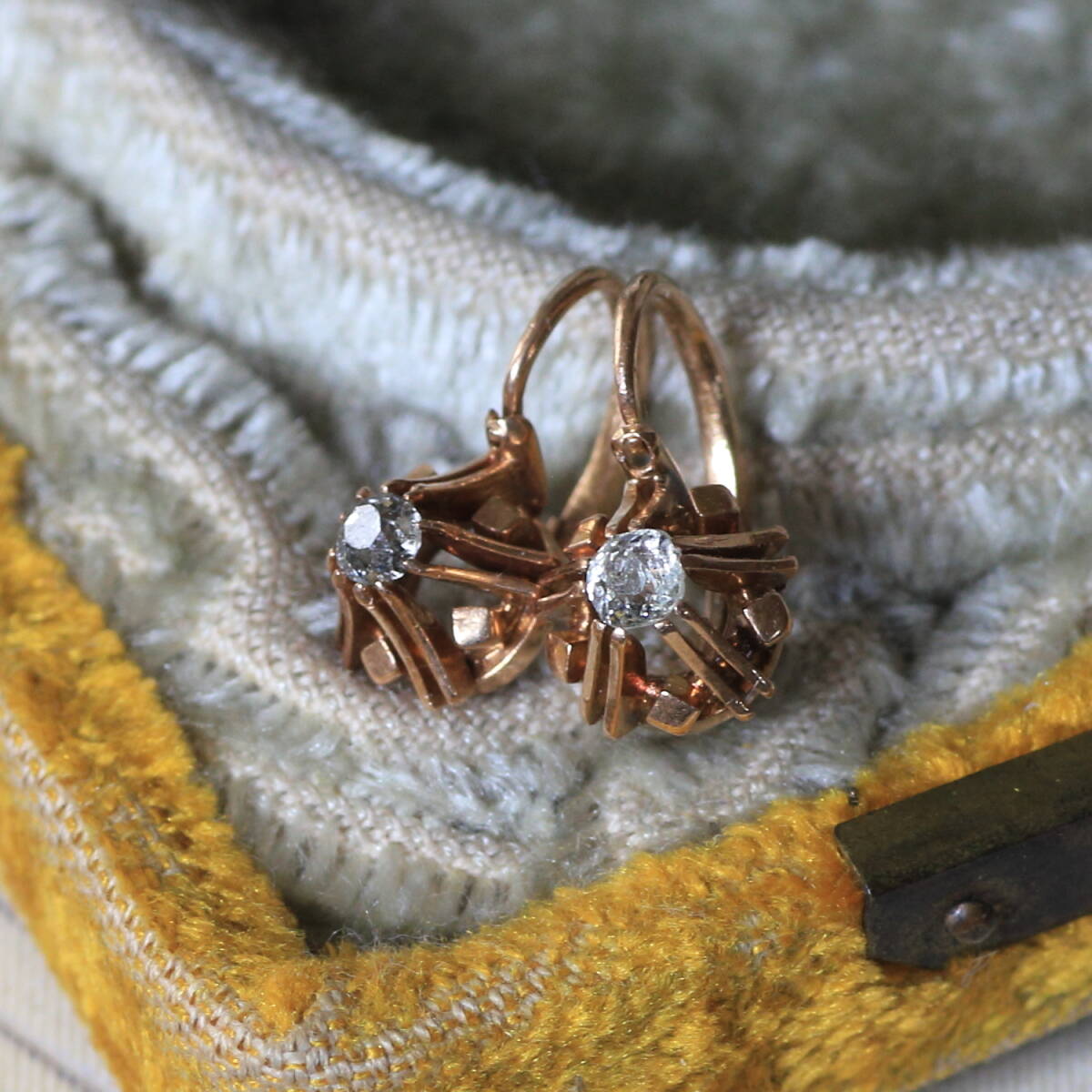 ぽってりとしたオールド カットダイヤのピアス。 金細工の台座も珍しいデザインです。 地金は18金、フランス特有の少し赤みを帯びたゴールドです。 留め具はアンティークによく見られるデザインで、 耳の後ろから前に差し込む「ドルムーズ」と呼ばれるピアスです。 ダイヤは約3ミリ、上品なサイズ感と耳に張り付く心地良い着用感です。 珍しいデザインで刻印が無い為 オリジナルで作成されたものではないかということでした。 ルーペで見るとダイヤにはソルト&ペッパーのような細かなカーボンが点在しています。 画像でご確認下さい。 ダイヤのチャーミングな個性を堪能していただける方に。