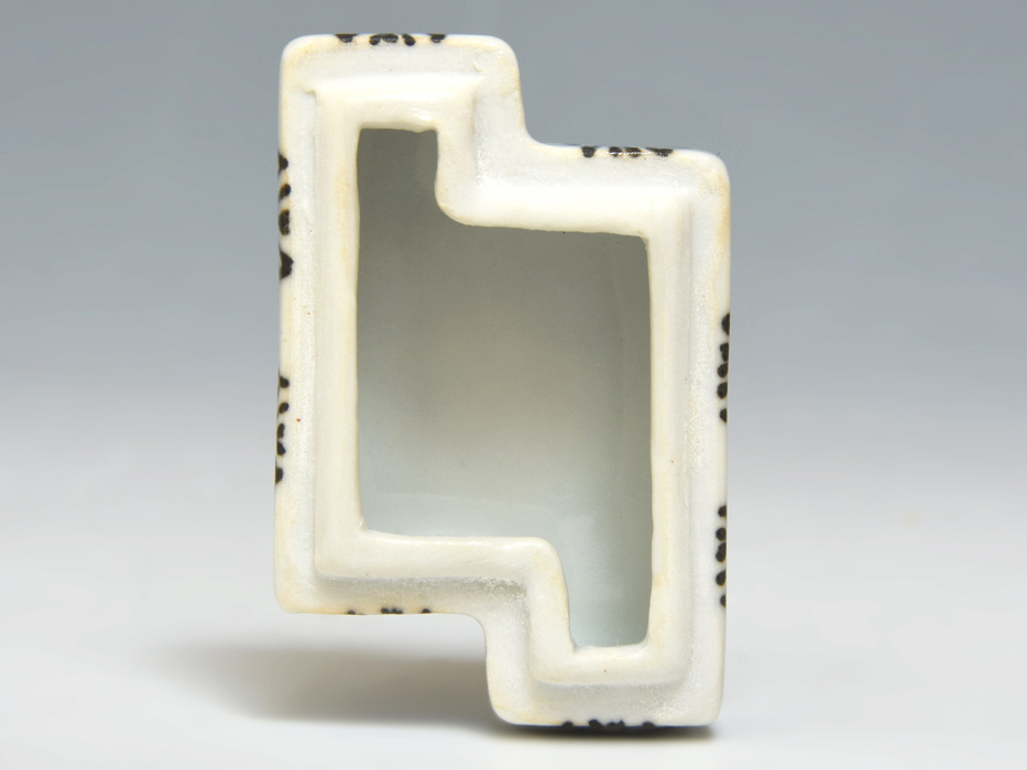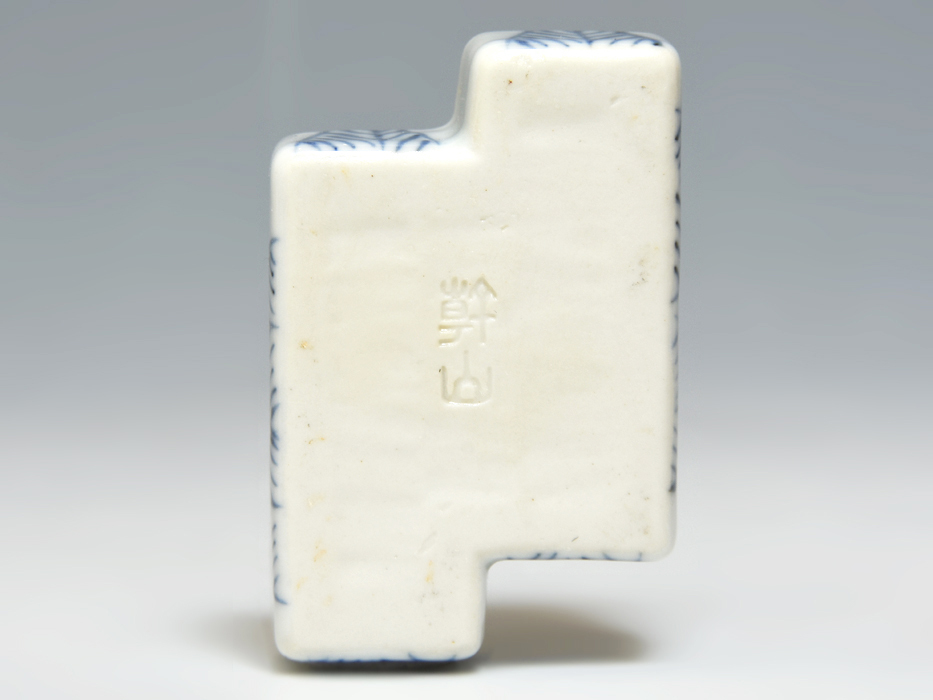 五世 幹山伝七 (作) 染付拍子木香合です。 拍子木(ひょうしぎ)とは、長方柱を二本食い違いに組み合わせた形のもの。 淡青な染付も良い印象の香合です。 型物香合番付西二段目に位置しております。 底部に銘あり。 未使用品ですのでキズ等無く良い状態です。 ※撮影の際に生じた写り込みなどがございます。 ご理解の程よろしくお願い致します。 |