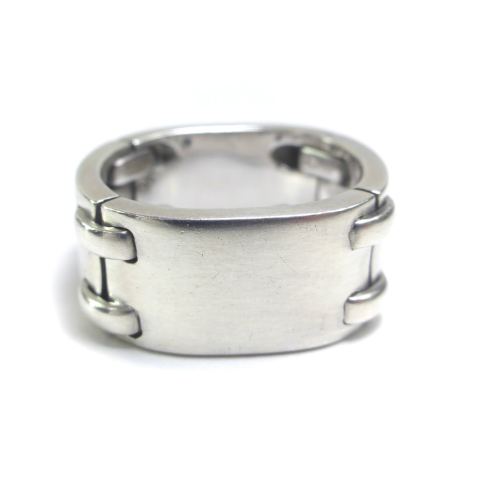| エルメスのシルバーリング。 ムスクテールという騎士が付ける幅広でフラットな襟をモチーフにしたリングです。 4つのプレートで構成されたナイスなフォルムで、ストリートやパンクスタイルにも相性抜群です。 サラッと一つだけで付けてもエレガントで、印象に残る指先を演出してくれるクールなシルバーリングです。 |