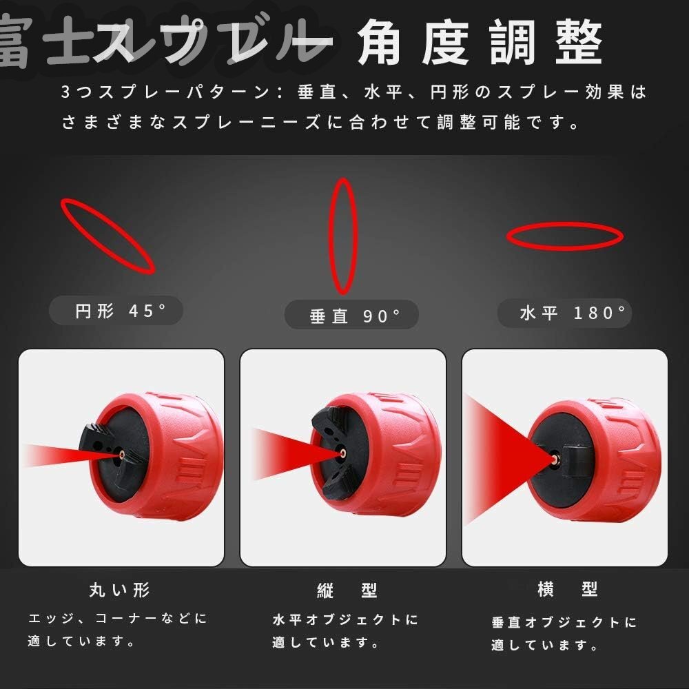 【3つのスプレーモード】この電動塗装機は3つのスプレーモード(水平、垂直、円形ジェット)があります。水平形状、水平面のスプレーに適しています。垂直形状、垂直面のスプレーに適しています。円形ジェット形状、コーナー、エッジのスプレーに適しています。ごニーズによって、最適なスプレーモードを選択できます。一つ1.8 mmのノズルが付属しています。20-40秒以内に漏斗に流れることができる塗料は最適です。使用する前に、塗料などの粘度をテストしてください。粘着性が強すぎる場合は、対応する希釈液を使用して塗料などを希釈する必要があります