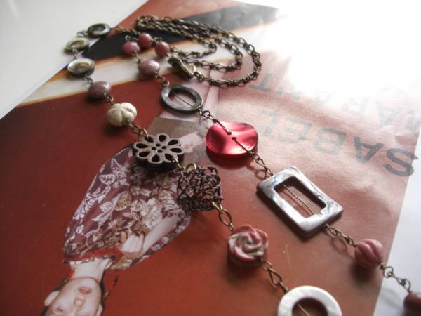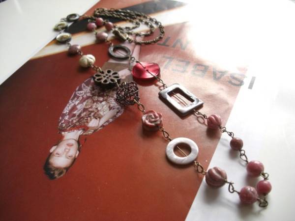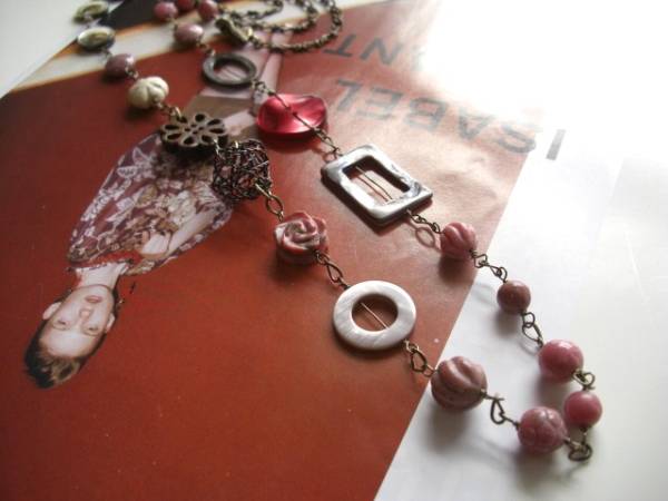 女の子・スタイル・・シリーズです♪遊び心を集めて・・シックなロードナイトのネックレスです♪丸玉やSライン、コインや薔薇などデザイン違いのロードナイトは甘 すぎないダークピンクです♪リバーストーンのフラワーや個性的なアンティークボタンやシェルリングやウッドの透かしフラワーを合わせてニューヨークモダンしてい ます♪ロードナイトは8ミリから14ミリ位までの丸玉、Sライン、コインや薔薇です♪リバーストーンのお花は14ミリ、ウッドの透かしフラワーは25ミリ位です♪長さは全長106センチ位で調節自由です♪2連にされても素敵です♪お揃いのブレスレットも出品しています♪シンプルで飽きのこないいつまでも着けられるデザインを考えて 作りました!ハンドメイドをご理解頂いてノークレーム、ノーリターンでお願いします
