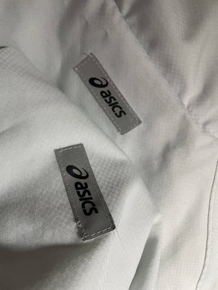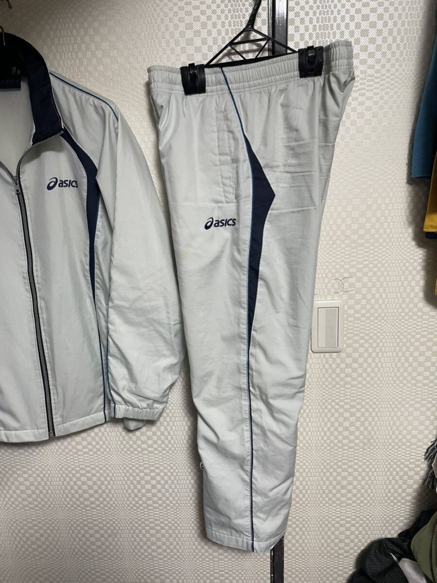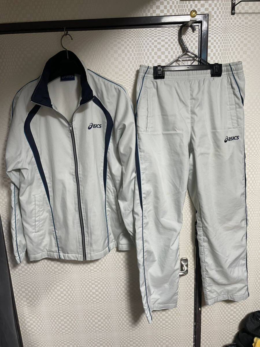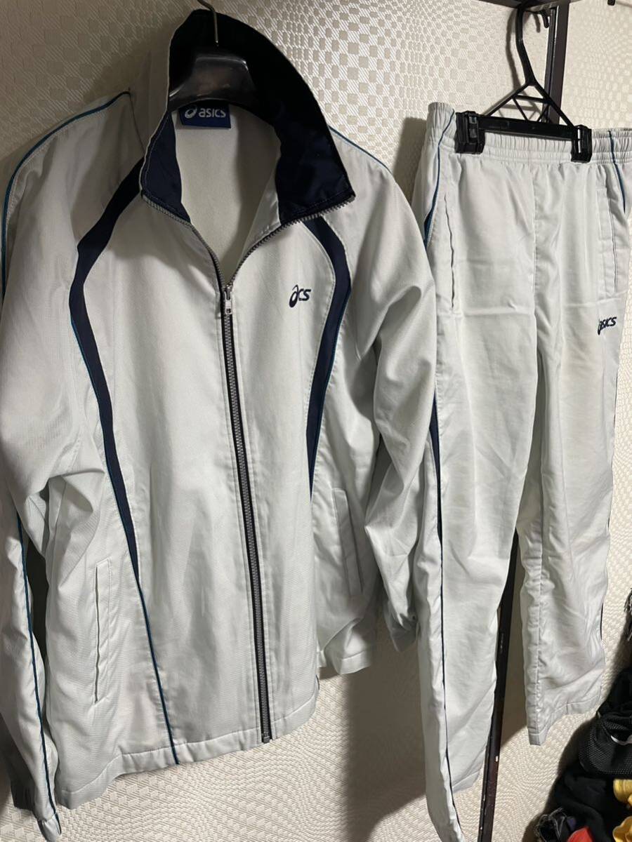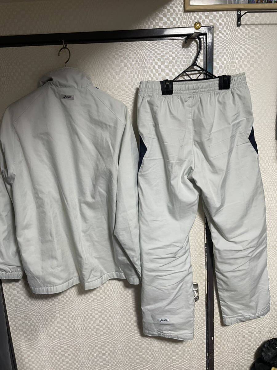 アシックスの裏地付きで暖かいセットアップです。サイズ平置き脇下身幅58、着丈70ウェストゴム36〜47股下71.裾幅21全長97センチ位です。使用に伴う薄いシミがあります。