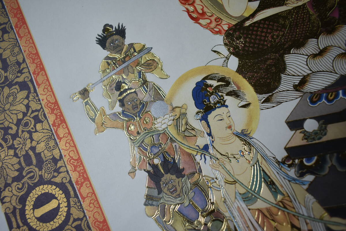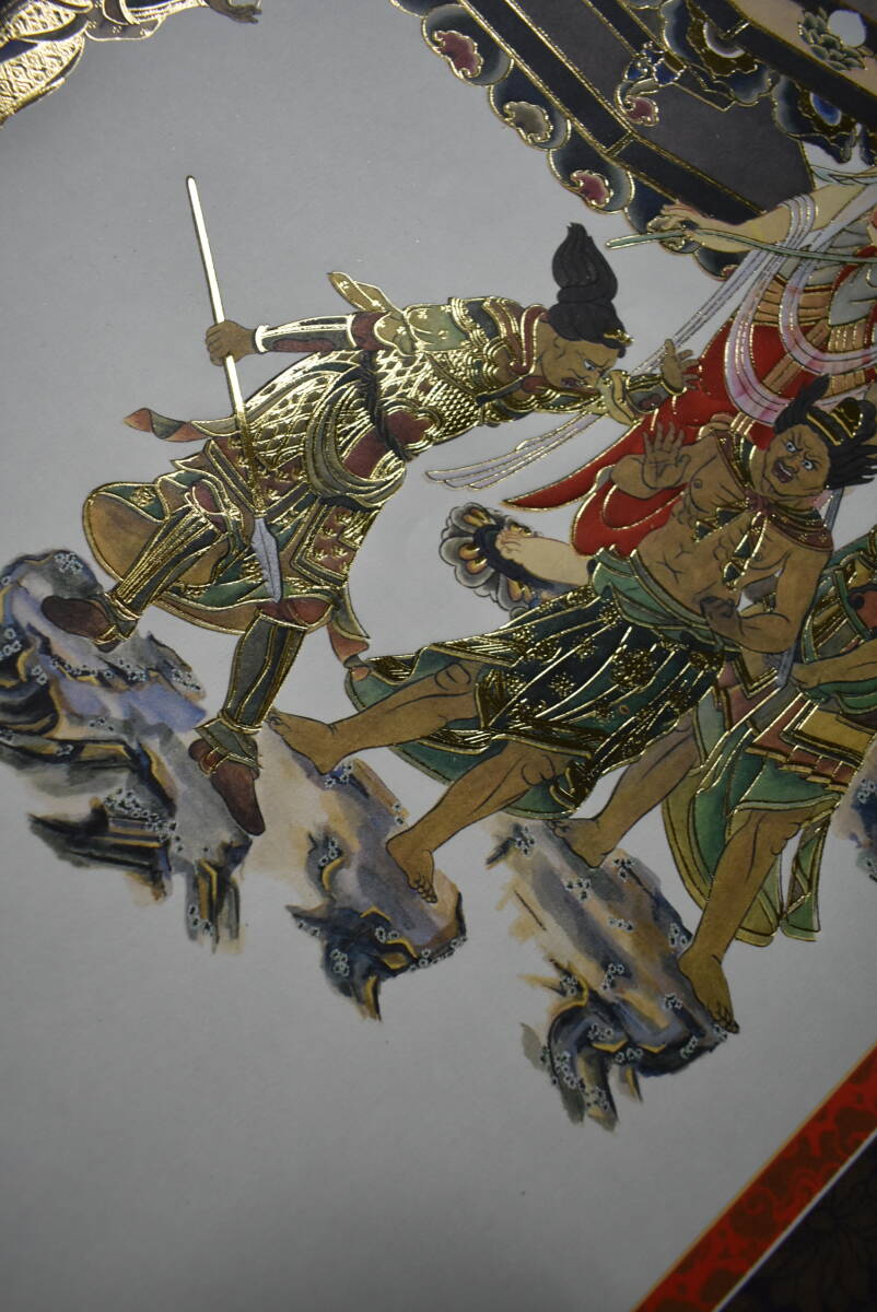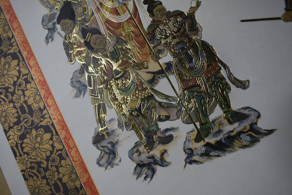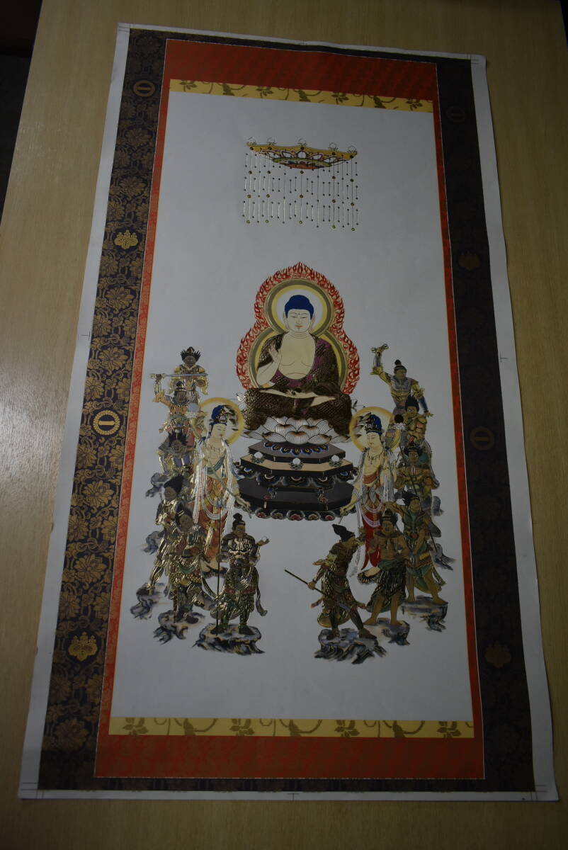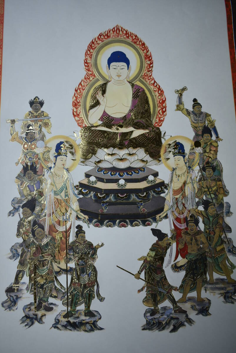 Qo964 :新品: 近世仏画 神像画 釈迦三尊 善神像 仏陀 釈迦如来 十二神将 金箔 Shakyamuni Tathagata Buddha painting 縦94cm 横51.5cm *80