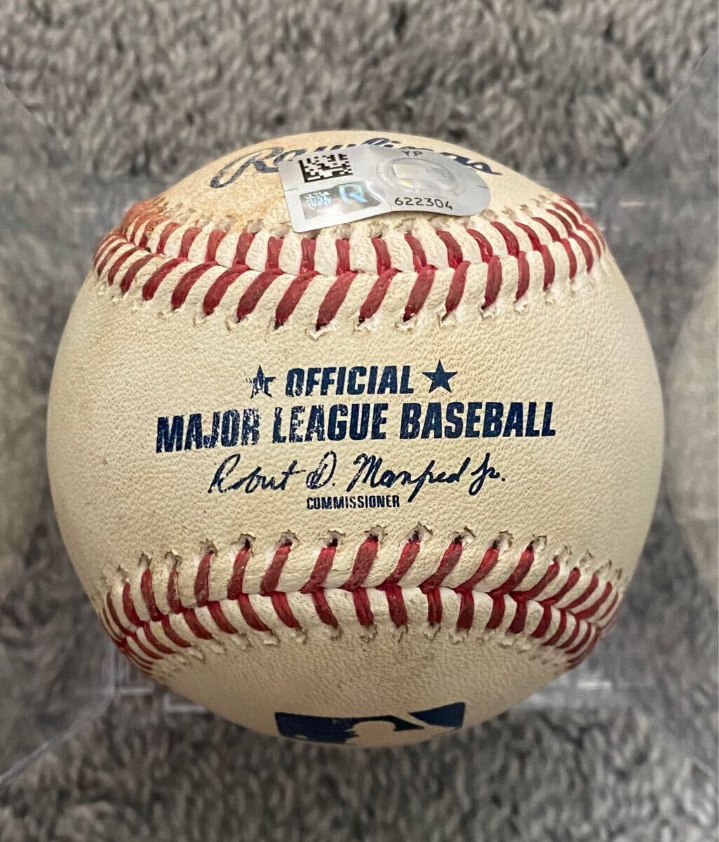 23年3月28日、マックスマンシーがセンターへヒットを打った際の実際のボールです。 またその時のセンターはマイクトラウト、彼が捕球したボールです。