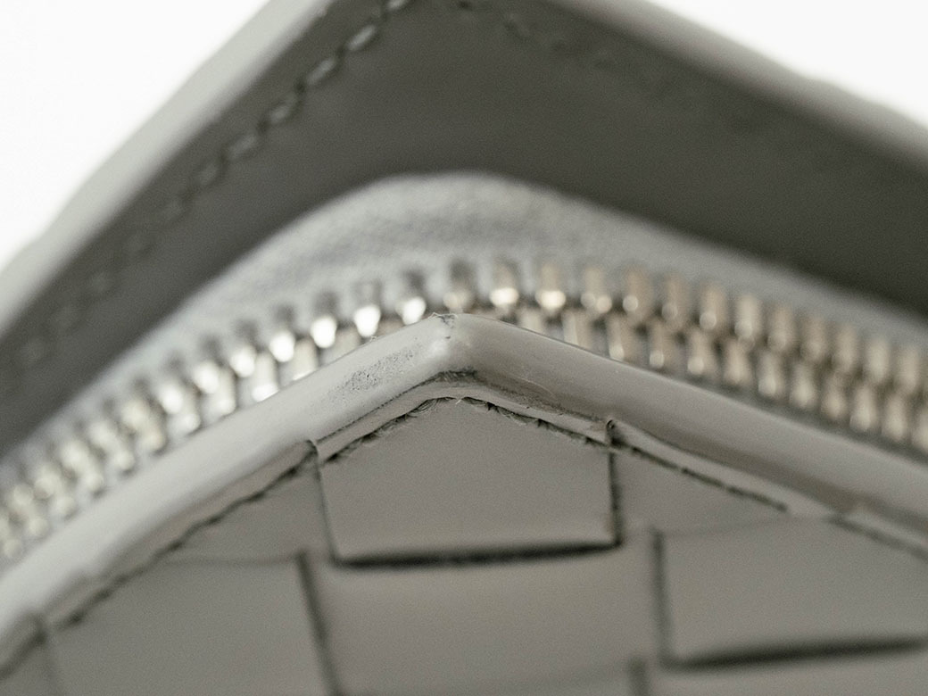 | 外側 | 若干型崩れ 全体に角度を変えると見える小さく薄いひっかきキズや小キズ多数 編み込みフチにやや毛羽立ち コバに薄汚れ 小さな角スレ 金具にキズ ファスナー金具に変色、引き手レザーにしわ |