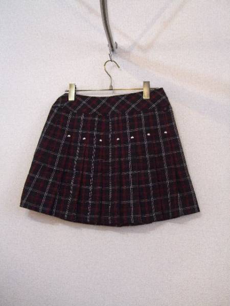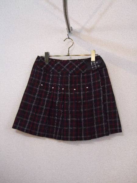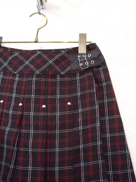 商品紹介 | 黒地に赤と白のラインが入ったチェックのプリーツスカートです。 プリーツの始まり部分に付いた丸いスタッズとウエストのベルトが デザインのポイントになっています。 巻きスカートの形で、膝の少し上くらいの長さです。 《素材》 ポリエステル65% レーヨン35% ベルト部分:合成皮革 |
