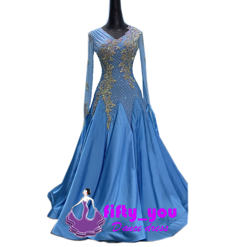 新品fifty_you レディース社交ダンス衣装 競技試合用ストレッチ付き素材ドレス モダンドレス サイズセミオーダー ライトストーン飾 水色