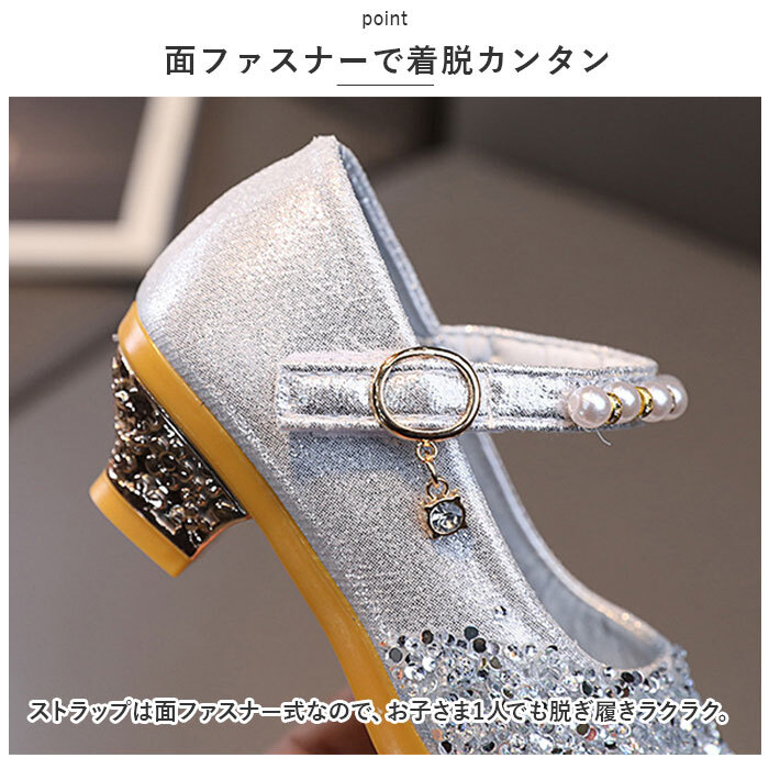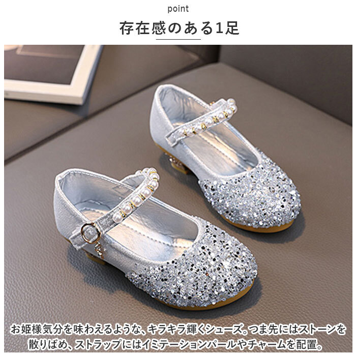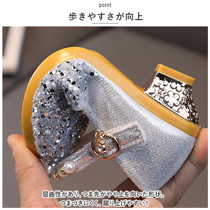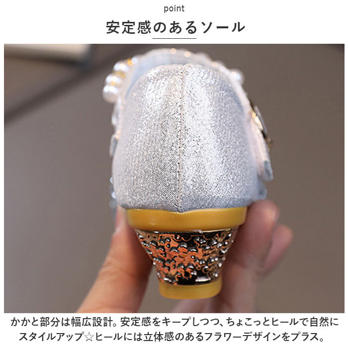 | 商品説明 | ・・足元もおしゃれに♪キュートなフォーマルシューズが登場。 ・【存在感のある1足】 ・お姫様気分を味わえるような、キラキラ輝くシューズ。つま先にはストーンを散りばめ、ストラップにはイミテーションパールやチャームを配置。 ・【面ファスナーで着脱カンタン】 ・ストラップは面ファスナー式なので、お子さま1人でも脱ぎ履きラクラク。 ・【歩きやすさが向上】 ・屈曲性があり、つま先がやや上を向いた形状。つまづきにくく、蹴り上げやすい! ・【安定感のあるソール】 ・かかと部分は幅広設計。安定感をキープしつつ、ちょこっとヒールで自然にスタイルアップ☆ヒールには立体感のあるフラワーデザインをプラス。 ・【フォーマルシーンで】 ・発表会やパーティーなどのお呼ばれシーンで大活躍! |
