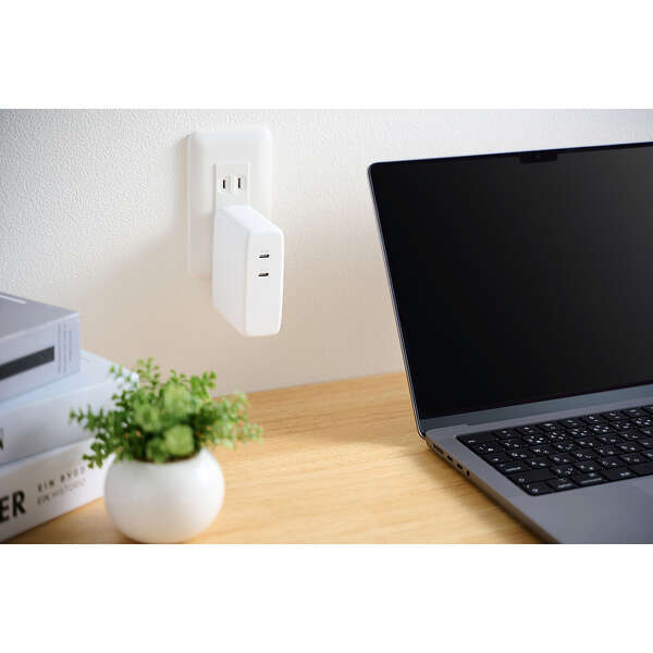 | ●AC充電器として1ポート接続時67W、2ポート同時接続時65Wの出力が可能。 スマートフォンとノートパソコンを同時に充電できます。 パソコンで作業をしている間にスマートフォンの充電を済ませられるから、 出張時・外出時にぴったり | |
