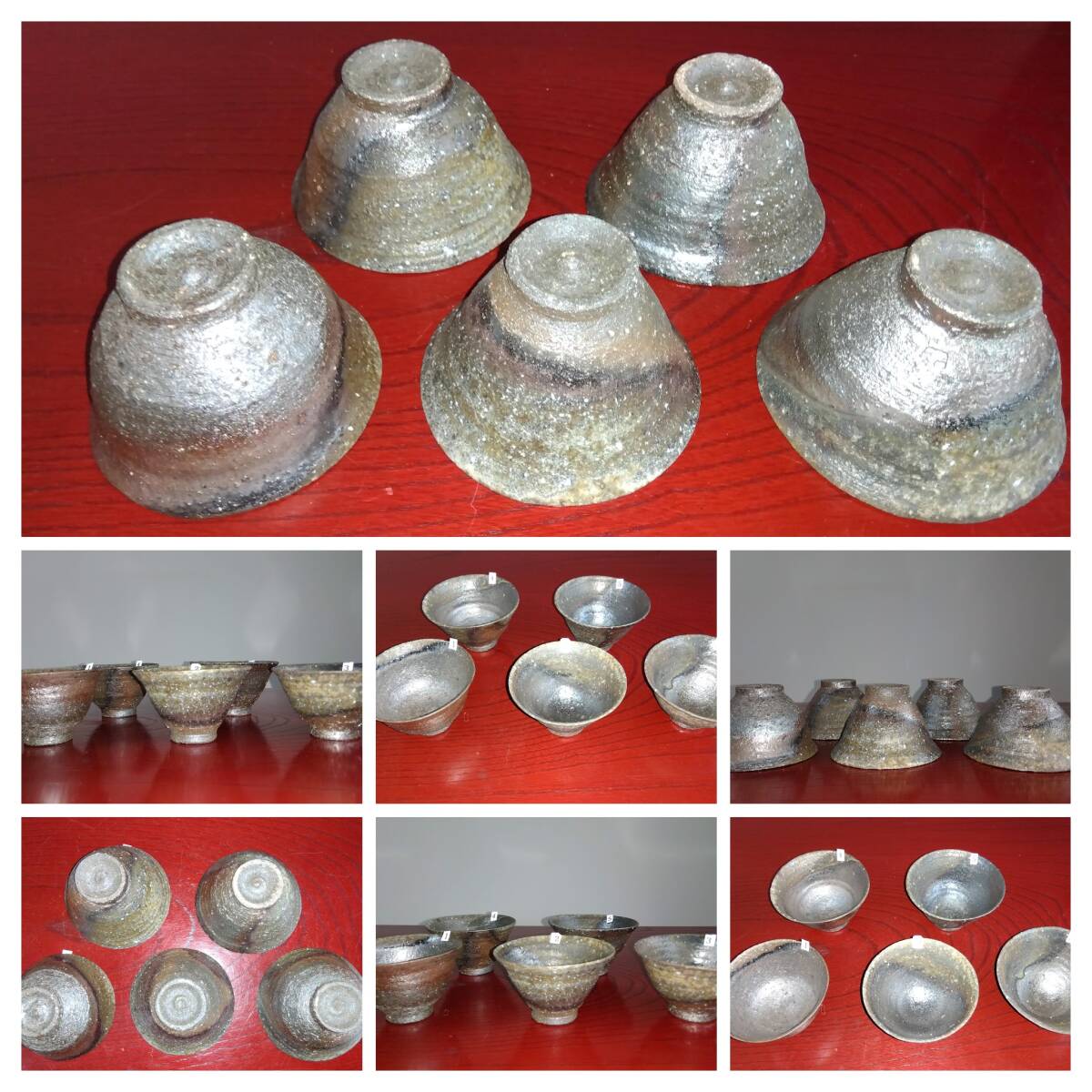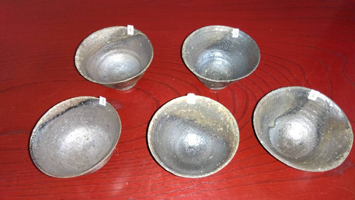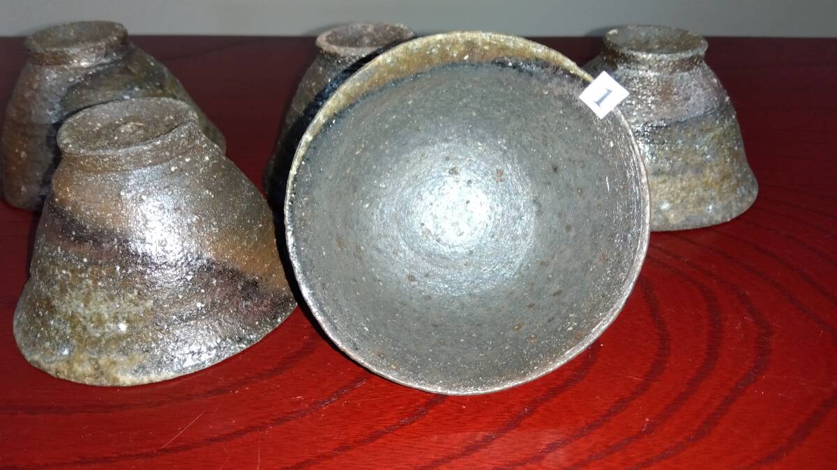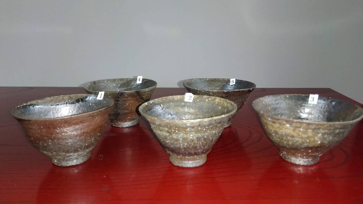 越前焼名工 桝田屋光生 自然灰釉還元窯変の究極美が迸る極上薄手茶器逸品5組セット 茶器としてのみならずぐい飲み酒器として申し分なく極上の酒へいざなうでしょう。 ヨーロッパの磁器にも勝るとも劣らない硬度と薄さ軽さを達成している湯みです。 極薄僅か3㎜程の口縁から5mmほどの胴体から成るこれらの茶器は デザイン美と品質強度が求められる京都の老舗の料亭に多くの品を納められて来た事を納得させる師の卓越した「至高の技」が昇華した逸品です。 心和む「自然灰釉還元窯変の究極窯変美」に焼き上がり、器に浮き出る自然灰釉美は越前焼魅力の世界を再確認させてくれます。 越前陶土「青ねば・赤べと・太古土」を活かす形で作られ、(陶土)が表す独特の質感/強度を最大限に活かす還元窯変美と自然灰釉美が組み合わさった魅力的な作品です。 盛られた料理を高級料亭の味へといざなうことをお楽しみください。 サイズ 口径105㎜ 胴高60/70mm 見込み50mm高台径15X45mm 包装:クラフトボックスプチプチ包装 出品者覧の【出品中の商品を見る】より 他にも多数の作品を出しておりますので御参照してください。 同梱可能ですので宜しくお願い致します