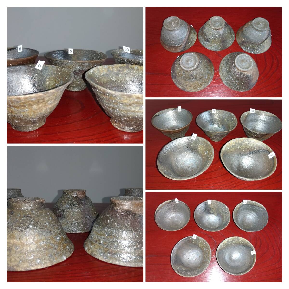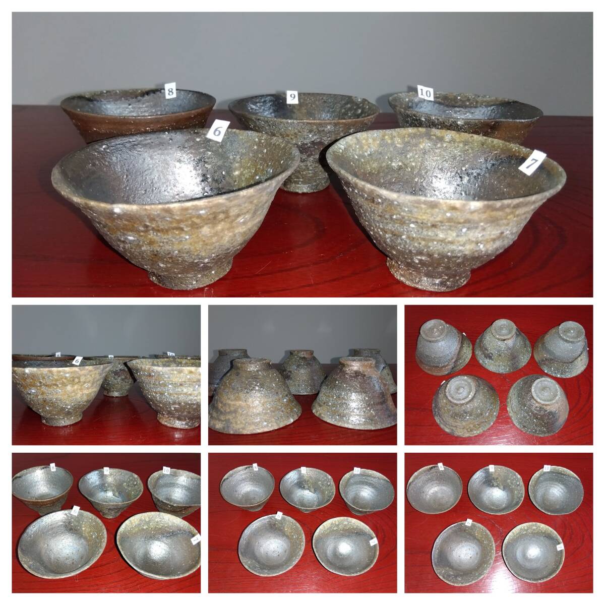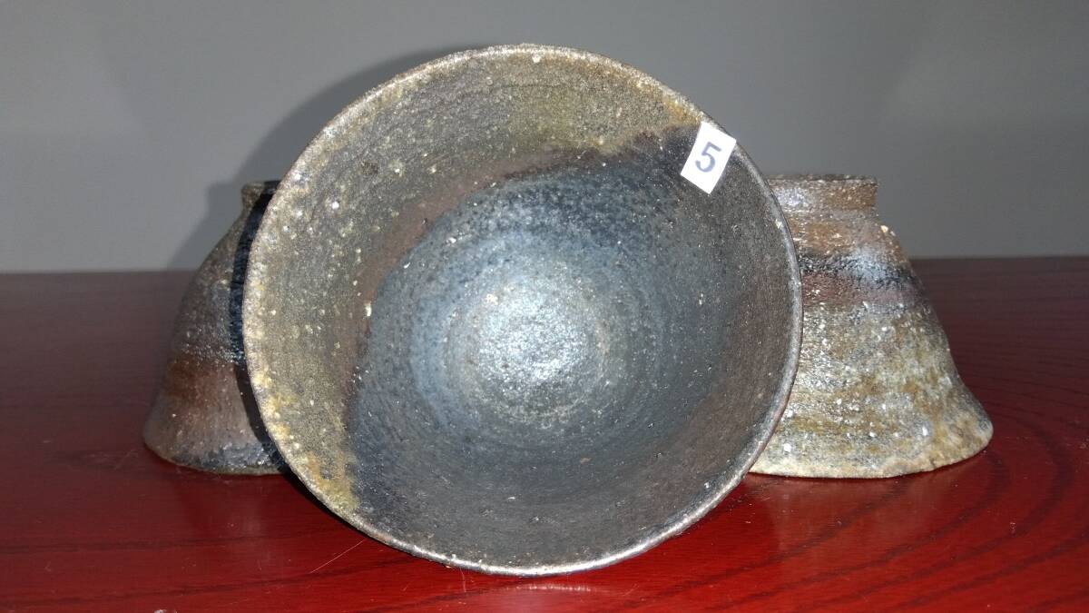 越前焼名工 桝田屋光生 自然灰釉還元窯変の究極美が迸る極上薄手茶器逸品5組セット 茶器としてのみならずぐい飲み酒器として申し分なく極上の酒へいざなうでしょう。 ヨーロッパの磁器にも勝るとも劣らない硬度と薄さ軽さを達成している湯みです。 極薄僅か3㎜程の口縁から5mmほどの胴体から成るこれらの茶器は デザイン美と品質強度が求められる京都の老舗の料亭に多くの品を納められて来た事を納得させる師の卓越した「至高の技」が昇華した逸品です。 心和む「自然灰釉還元窯変の究極窯変美」に焼き上がり、器に浮き出る自然灰釉美は越前焼魅力の世界を再確認させてくれます。 越前陶土「青ねば・赤べと・太古土」を活かす形で作られ、(陶土)が表す独特の質感/強度を最大限に活かす還元窯変美と自然灰釉美が組み合わさった魅力的な作品です。 盛られた料理を高級料亭の味へといざなうことをお楽しみください。 サイズ 口径105㎜ 胴高60/70mm 見込み50mm高台径15X45mm 包装:クラフトボックスプチプチ包装 出品者覧の【出品中の商品を見る】より 他にも多数の作品を出しておりますので御参照してください。 同梱可能ですので宜しくお願い致します