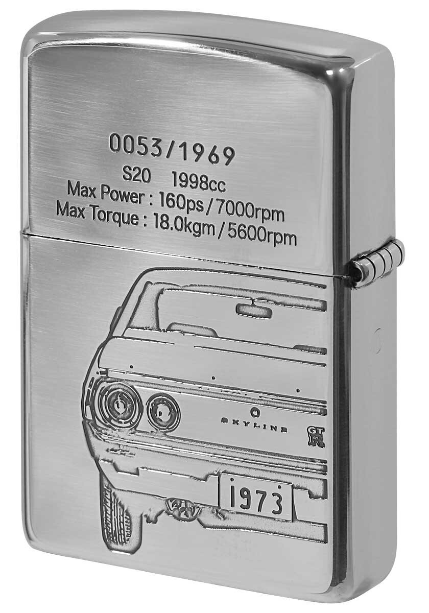 世界に誇る日本の名車「日産スカイラインGT-R」のZIPPOライター。日産自動車のオフィシャルライセンス製品で、歴代のスカイラインGT-Rの意匠と諸元を忠実に再現。表面には歴代のスカイラインGT-Rのロゴに、車体フロントビュー、登場年と型式。裏面には4灯の特徴的なテールランプを含むリアビュー、エンジン型式、最高出力、最大トルクのスペックを記載。さらに、初代スカイラインGT-Rが登場した1969年にちなみ、1969個の限定生産を表すシリアルナンバーが記載されたスペシャルなZIPPOです。