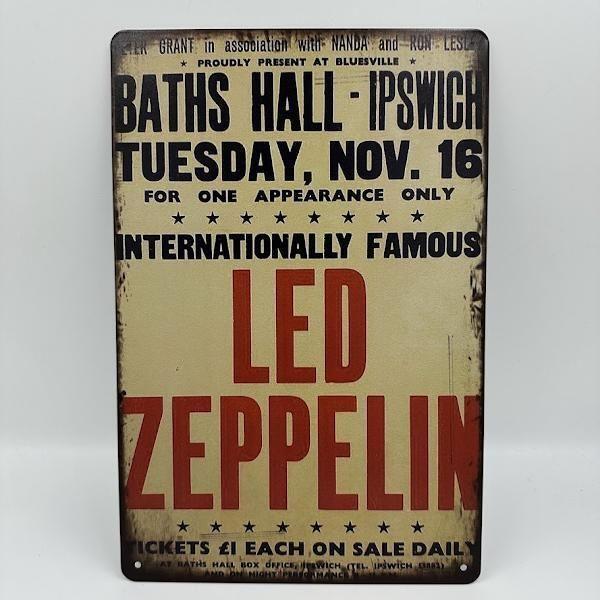 伝説のロックバンド、レッド・ツェッペリンのコンサートポスターデザインのブリキ看板です。Baths Hallで行われた1970年代の象徴的な公演を再現したヴィンテージ風デザインは、ロックファンにとって必見のアイテムです。ヴィンテージ風の仕上げが施されており、どこに飾っても目を引くこと間違いなしです。