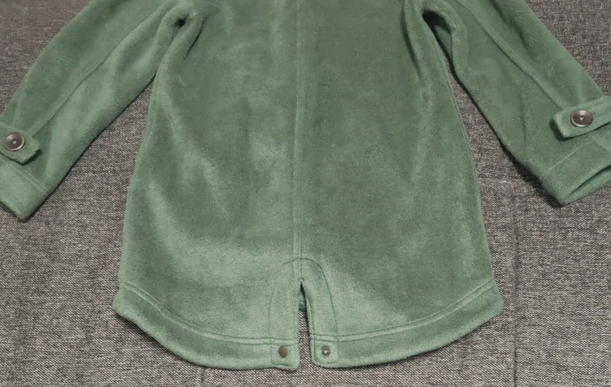 後ろ側の裾にボタン付き。ボタンを外してスリットにして着る、ボタンをとめて着る、どちらでも着れます。