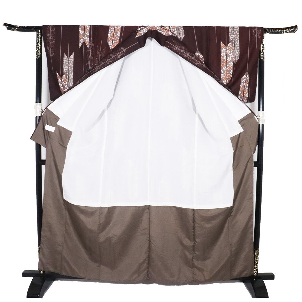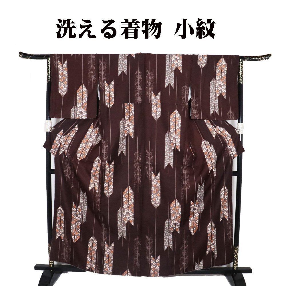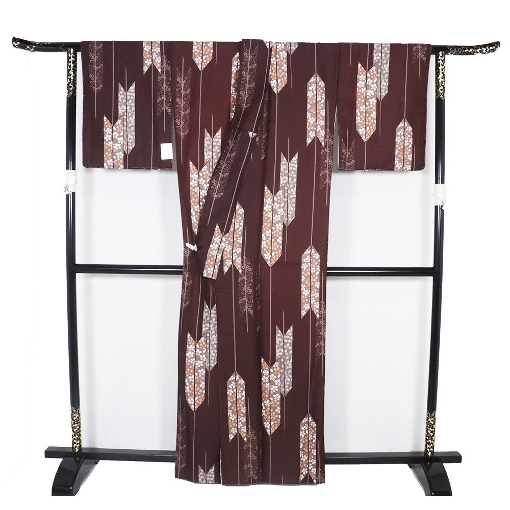 | 小紋 袷 赤茶紫地 矢絣・桜・南天・撫子 163 広襟 L寸 新品 仕付け付き |