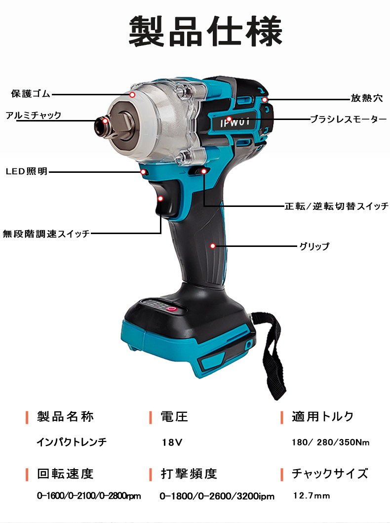 【ブラシレスモータ】ブラシレスモータ搭載2つのモードがありす現場作業の効率をあがります。正逆転オートストップモード:連続した仮締めから、緩め作業時のナット落下防止に(各2段階)。スイッチ全速モード:スイッチを少し引けば、一気に全速回転(設定した打撃力の最大回転数)。最大締付トルク:350N・M 最大回転数:2800r/min