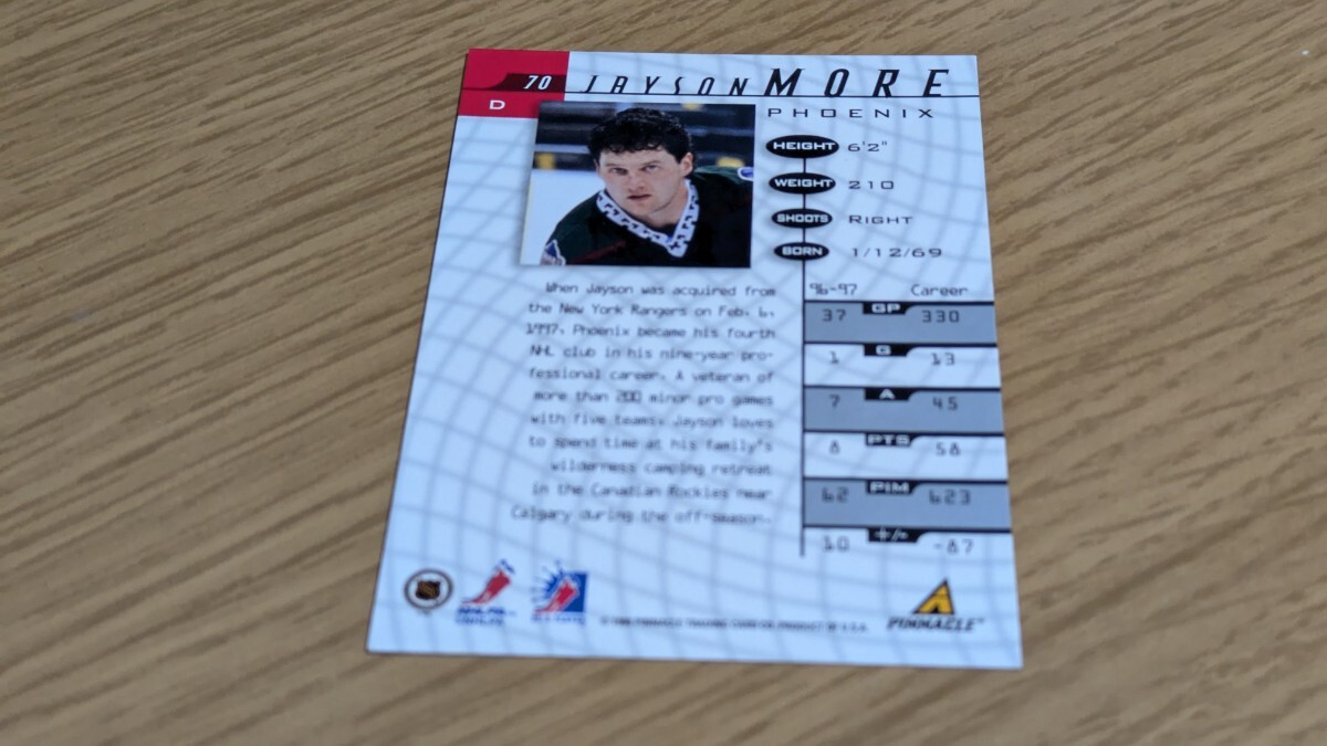 Jayson More 。カナダ出身。1969年1月12日生まれ。185cm95キロ。プロアイスホッケーの最高峰NHL1987年ドラフト10位にてニューヨーク・レンジャーズに指名され契約。1988年〜1999年の10年間にわたりディフェンスマンとして活躍、通算406ゲーム出場。