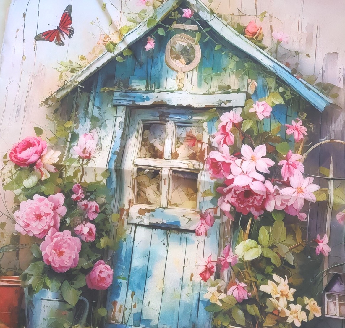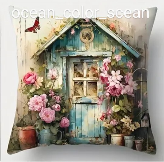 こちらは、 新品未使用 ライトブルー ハウス お花 油絵風 ポリエステル クッションカバー インテリア になります♪