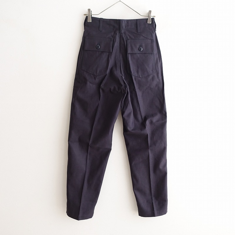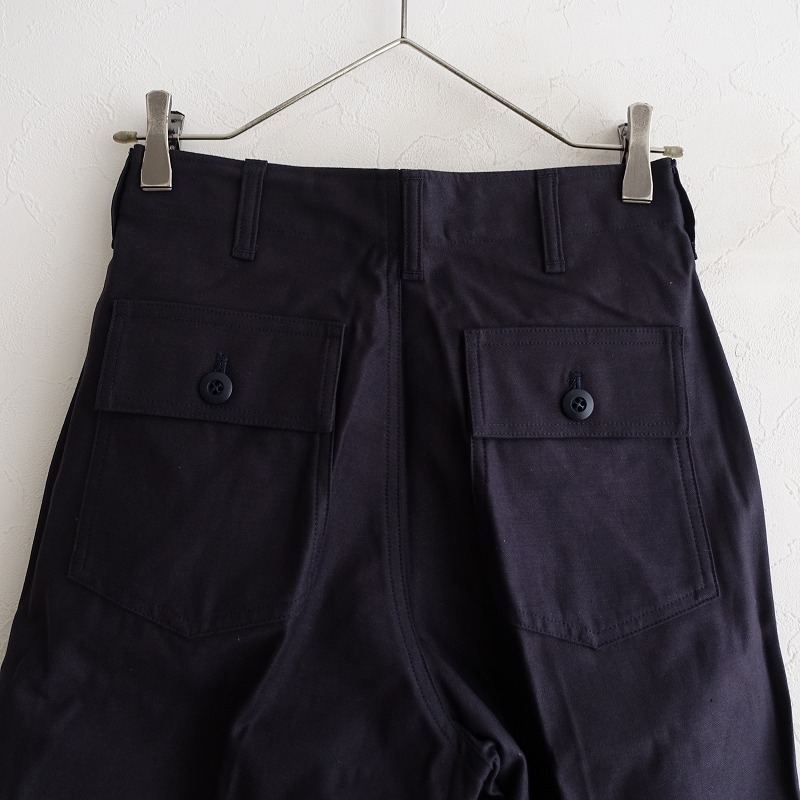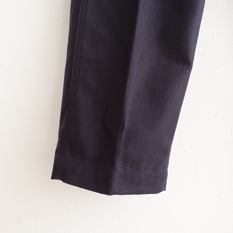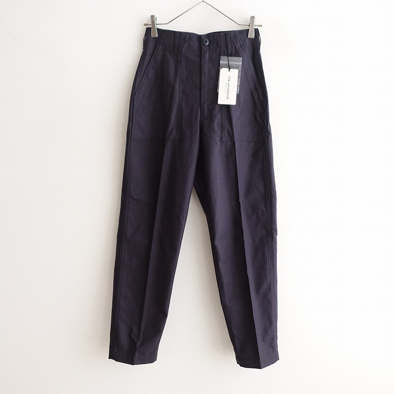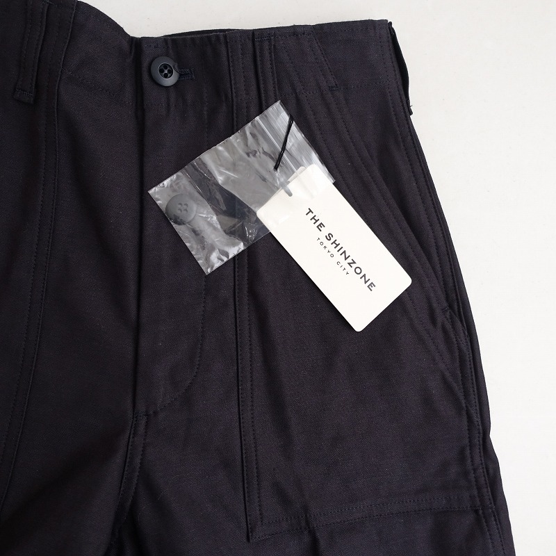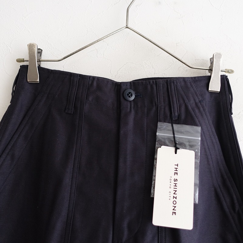 | THE SHINZONEのベイカーパンツです。カラーはネイビー系で、経年劣化を楽しめる厚手のコットン地で仕立てられております。センタープレスを入れ、キレイめなスラックスのようなデザインで、フロント開口部はジップフライ仕様です。ポケットは4つ、定価(メーカー希望小売価格)20,900円 税込みの商品です。 |