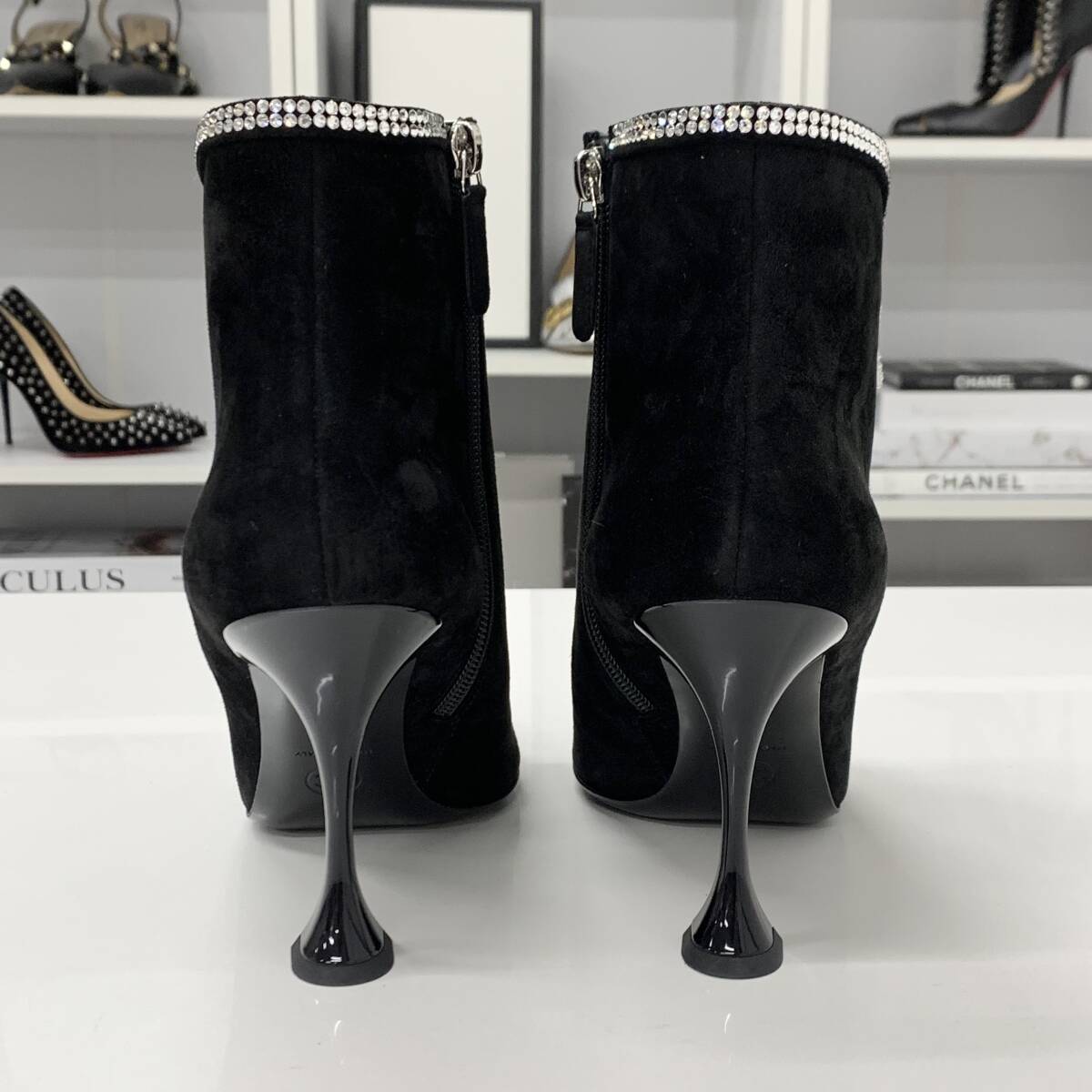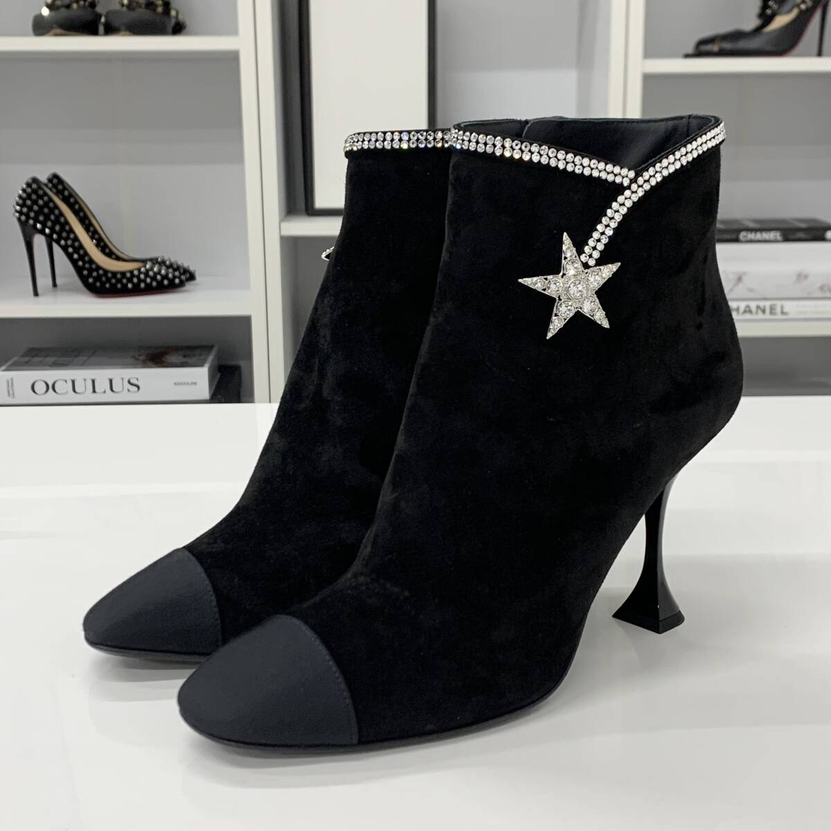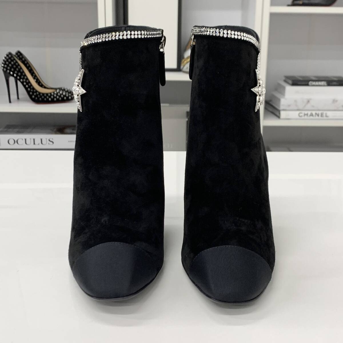 シャネル スエード ラインストーン スター ショートブーツ ブラック