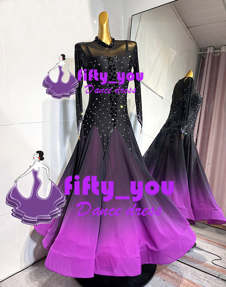 新品fifty_youレディース社交ダンス衣装 サイズセミオーダー モダン競技デモドレス  スタンダードドレス  グラデーション 黒紫 石飾り